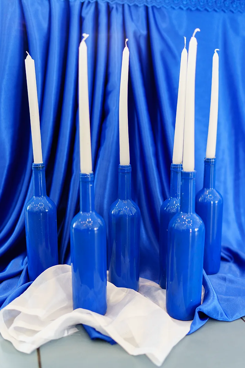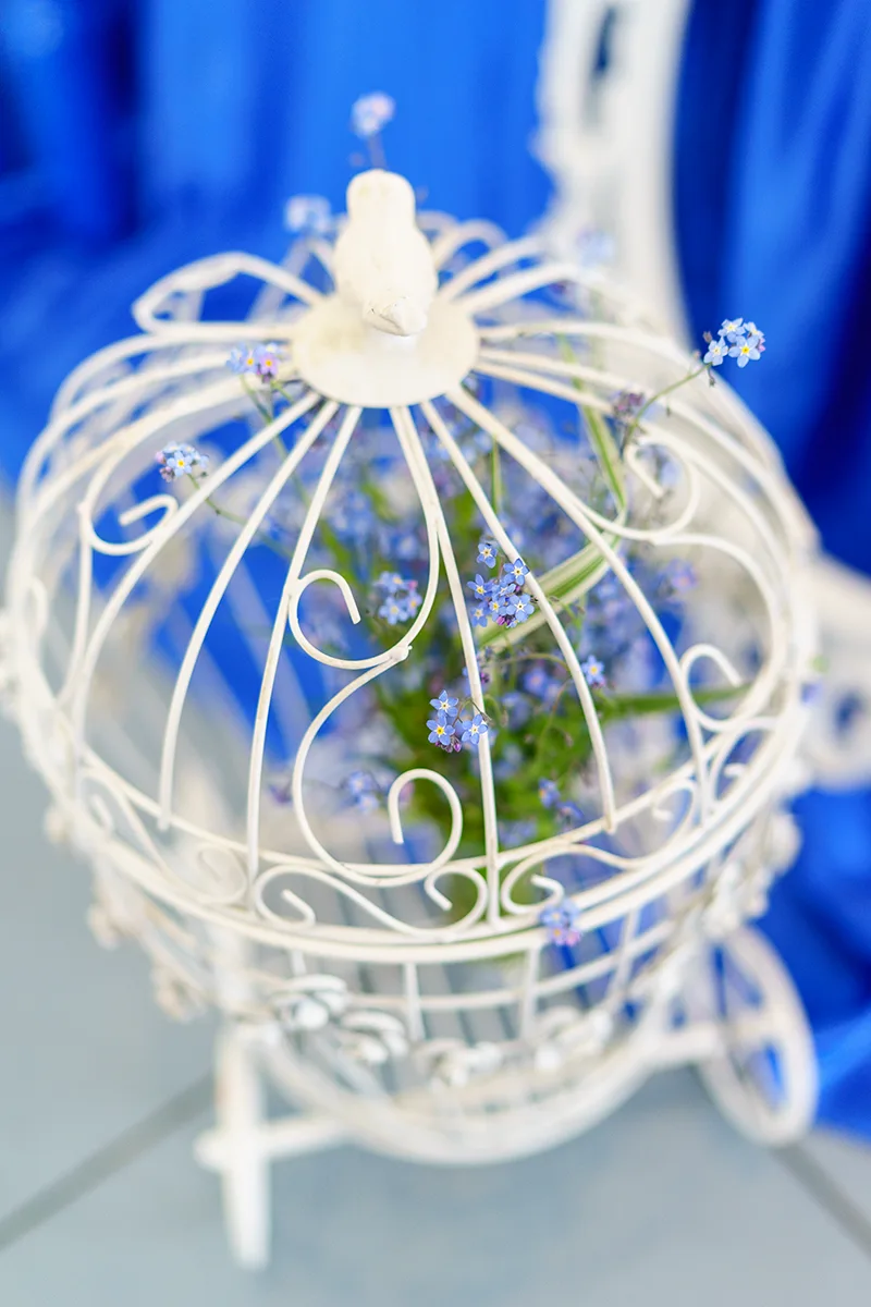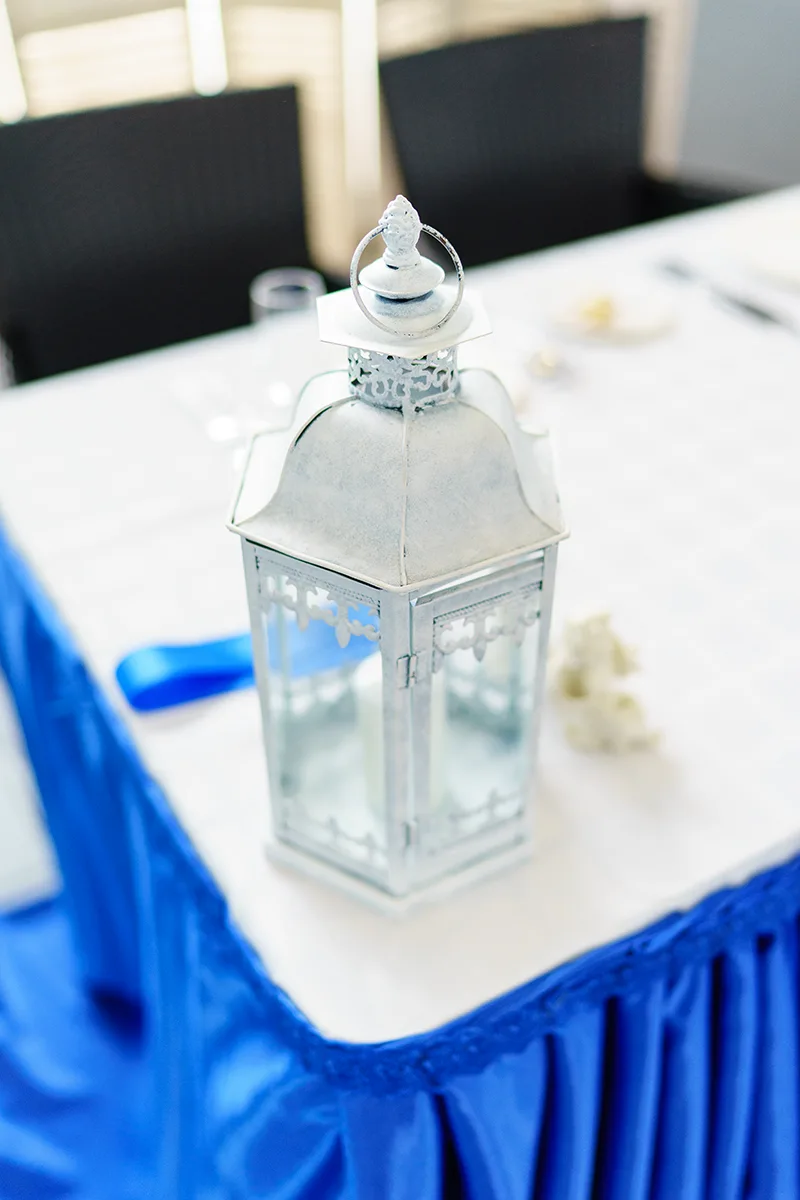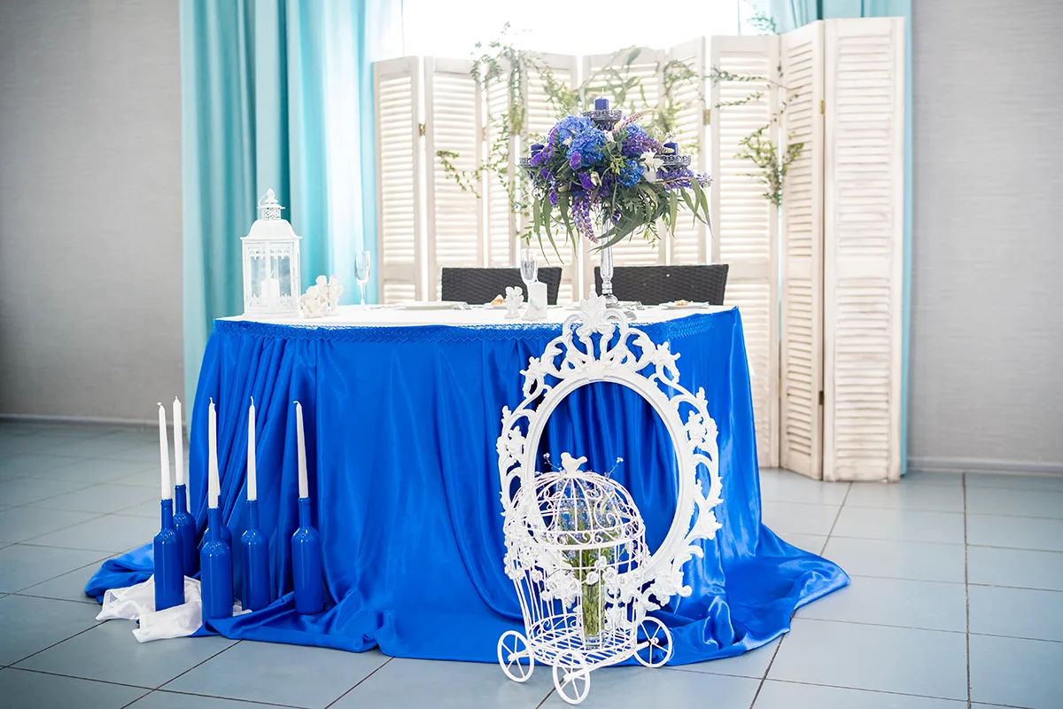 Посередине зала у окна, поставили стол для молодых, задрапировали его синей атласной тканью с синим кружевом. Рядом со столом поставили белые свечи в винных бутылках, покрашенных в синий цвет, в тон атласной ткани. С другой стороны стола поставили белую рамку от винтажного зеркала и декоративную клетку с букетом свежих незабудок внутри.