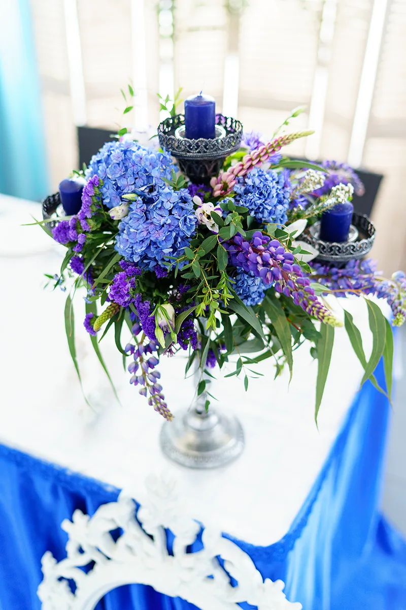 На стол установили различные декоративные фигурки, подсвечники, свечки и большую растрепанную композицию из голубых гортензий, синих люпинов, фиолетовой статице и эвкалипта в высоком трехрожковом винтажном металлическом подсвечнике с синими свечами.