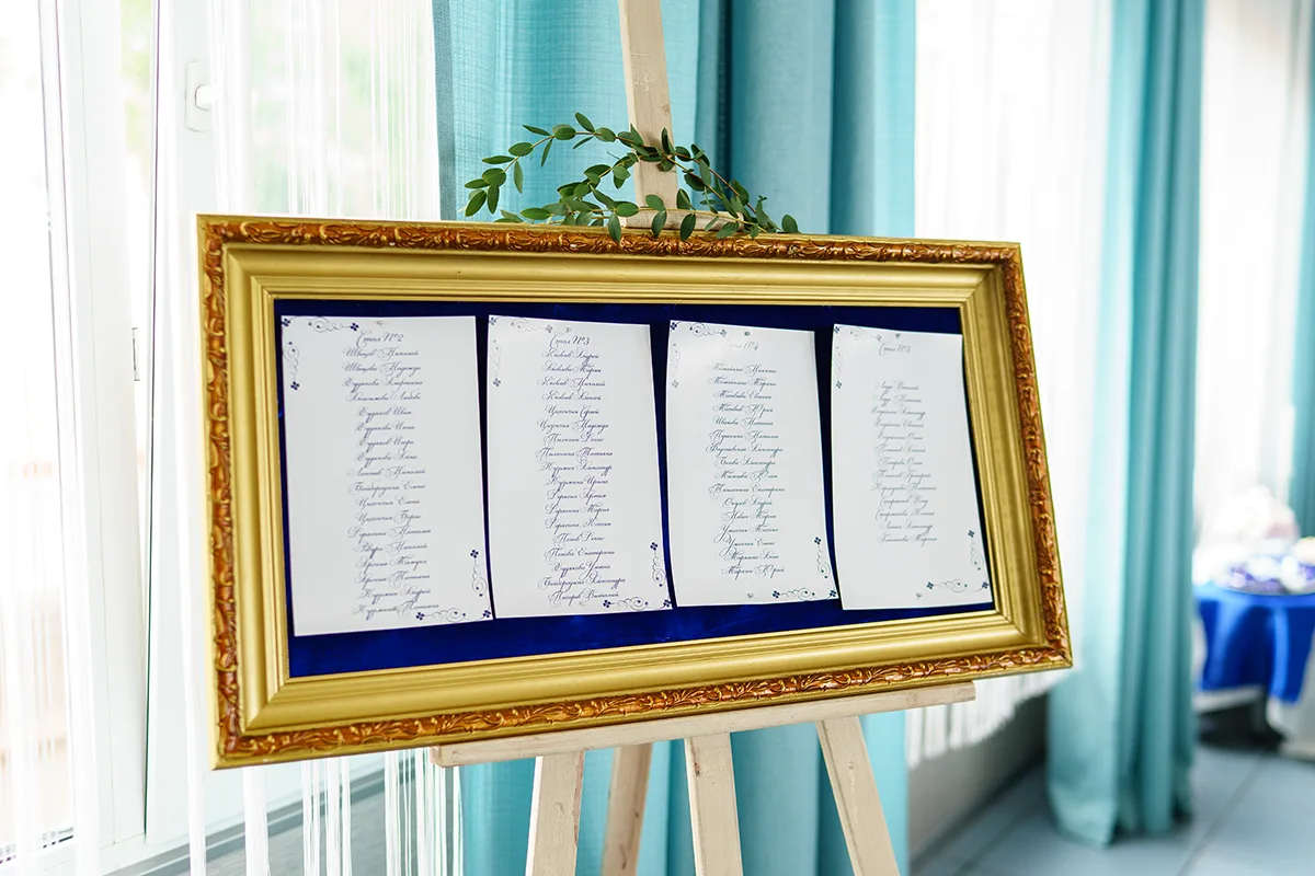 Для плана рассадки создали картину с фоном из синего бархата и широкой рамкой из золотого винтажного багета, распечатали карточки с планами рассадки и именами гостей. Картину поставили на белый мольберт и украсили веткой эвкалипта.