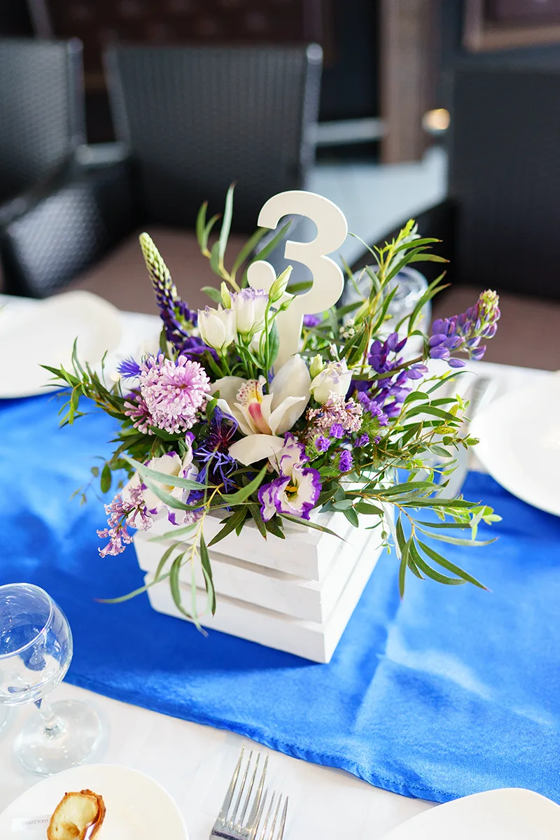 Столы оформили наперонами из синей атласной ткани и композициями из свежих цветов в деревянных белых ящиках. Композиции собрали из синих люпинов, синей статице, белых орхидей и свежей сирени с эвкалиптом. Номера столов изготовили из тонкой фанеры, покрасили в белый цвет и вставили в центры композиций. Разложили карточки гостей.