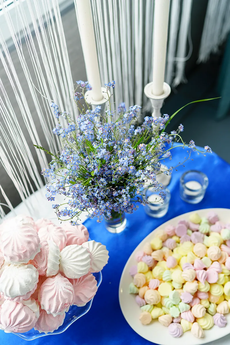 Сладкий стол для детей украсили напероном из синей атласной ткани, свечками в стеклянных подсвечниках и свечками на высоких белых подсвечниках. Поставили в стеклянную вазочку букет из свежих голубых незабудок.