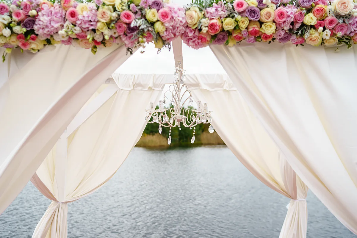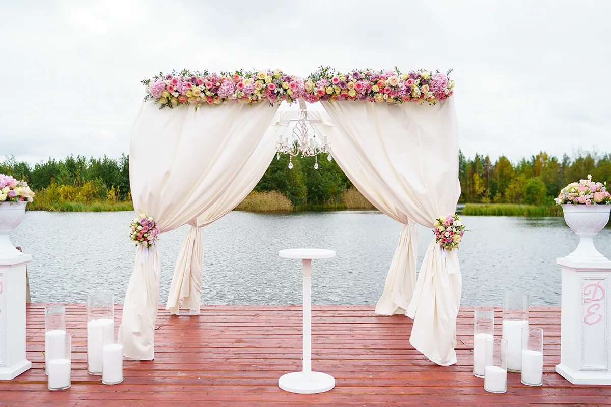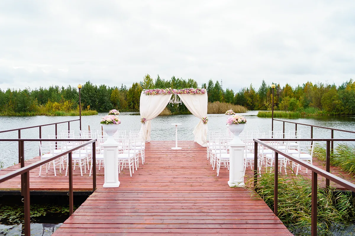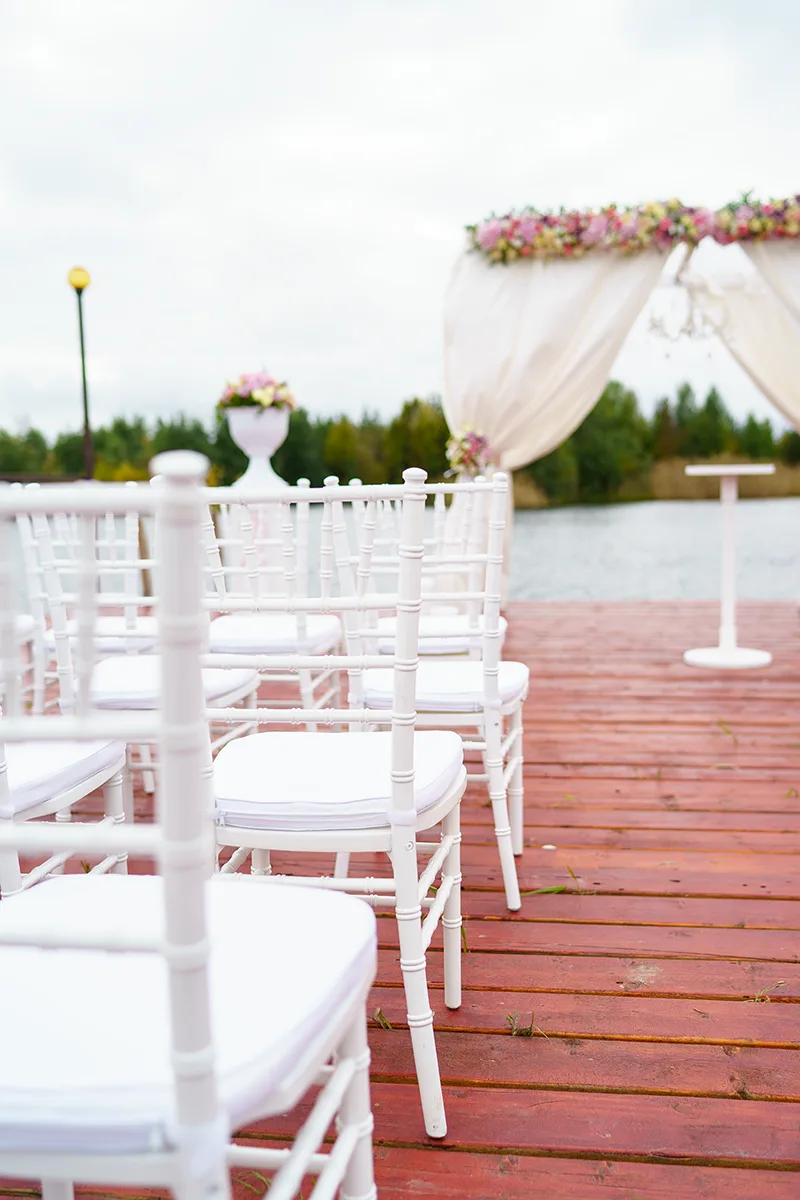 - Оформление выездной церемонии на причале озера свадебной аркой с тканями, хрустальной люстрой и цветочными композициями, вазами с цветами на тумбах, стеклянными насыпными свечами и стульями Кьявари;