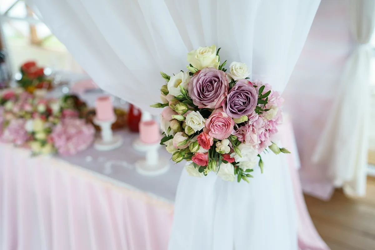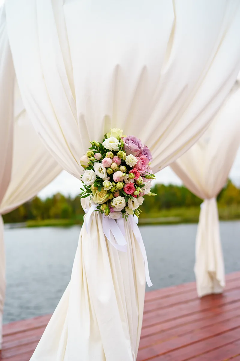 - Создание большой свадебной арки с занавесками из плотной ткани, тумб под вазы с цветами;
