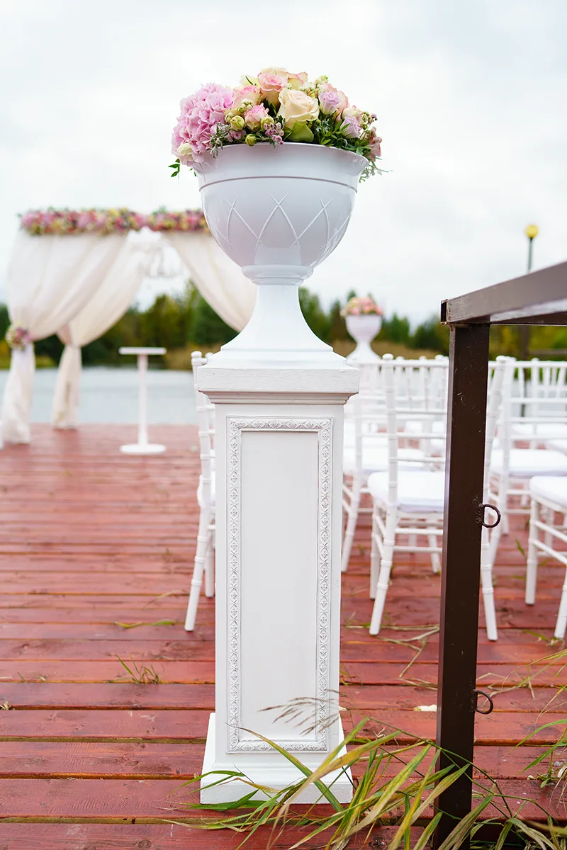 Также для выездной церемонии изготовили высокий столик для колец и ведущего церемонии. Изготовили декоративные тумбы, на которые установили вазы с большими цветочными композициями. Перед свадебной аркой на причале выставили стулья Кьявари для гостей.
