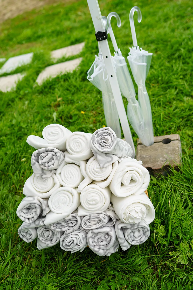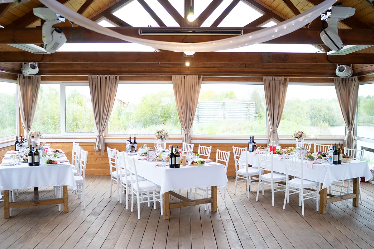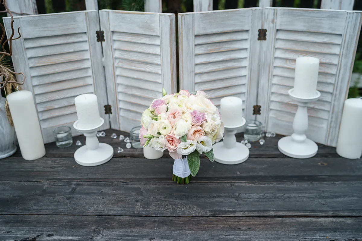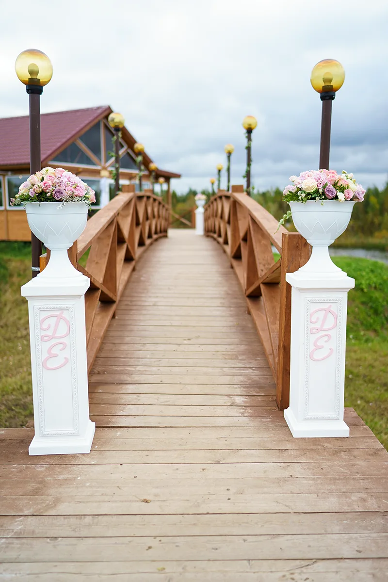 - Создание отдельной фотозоны на улице на фоне озера с баннером, цветочной композицией, вазами с цветами на тумбах и стеклянными насыпными свечами, предоставление пледов и зонтов;
