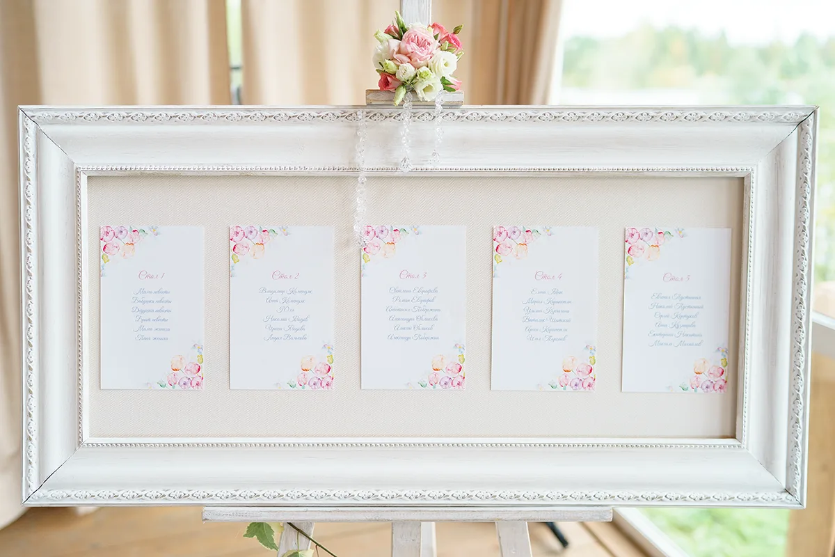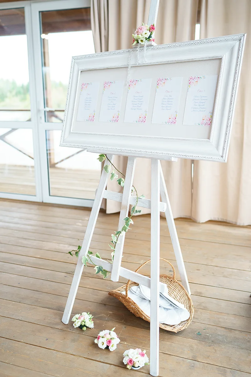 Для оформления зоны плана рассадки мы изготовили картину с основанием из плотной ткани, обрамленную винтажной белой широкой рамкой. Установили картину на белый состаренный мольберт, украсили маленькой цветочной композицией и искусственным хрусталем. На ткань картины прикрепили заранее распечатанные в цвете карточки с планами рассадки гостей. Мольберт украсили зеленью, расставили рядом маленькие цветочные композиции и корзинку с уютными тапочками для гостей.