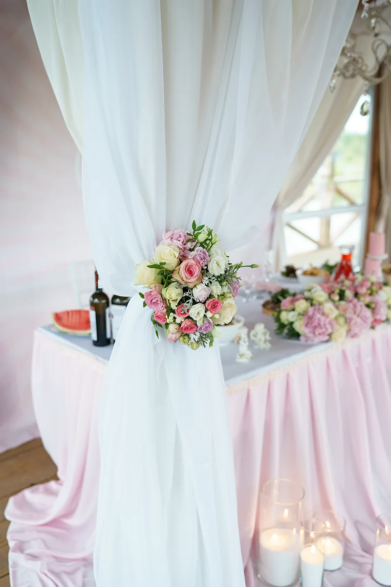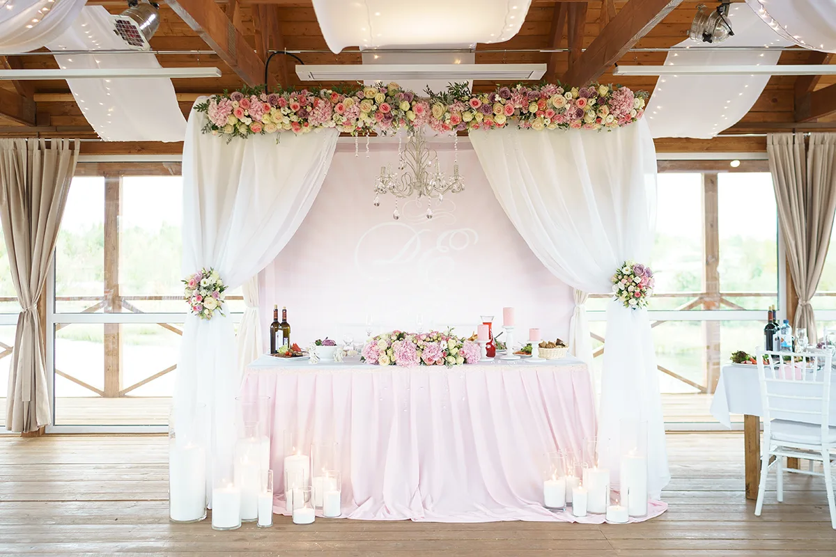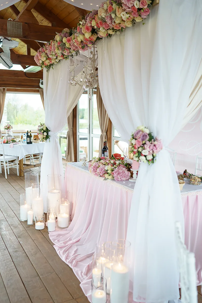 - Оформление стола молодых свадебной аркой с фоном-баннером, тканями, хрустальной люстрой и цветочными композициями, шелковой нежно-розовой тканью, стеклянными насыпными свечами, подсвечниками и свечами;