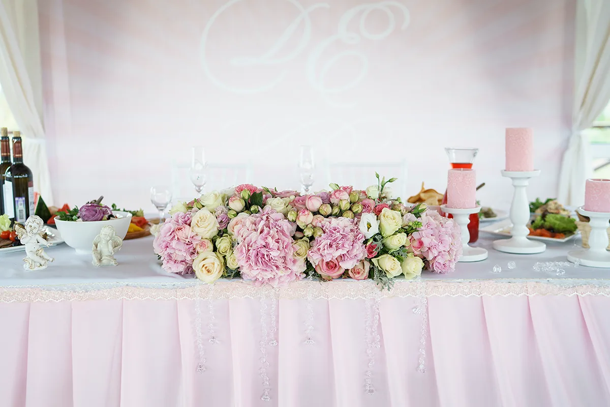 Стол молодых поставили в свадебную арку с тканями, хрустальной люстрой посередине и большой цветочной композицией сверху вдоль всей арки, Стол задрапировали шелковой розовой тканью с кружевом, украсили искусственными хрусталиками и поставили на него специальную композицию из живых розовых гортензий, роз и эустом. Рядом поставили стеклянные насыпные свечи, а позади натянули баннер с розовым фоном и белым фамильным гербом.