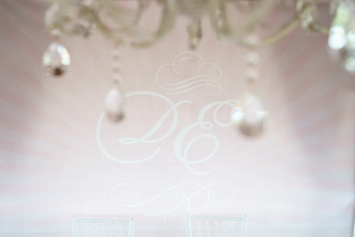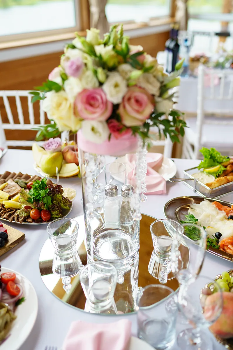 - Оформление столов цветочными композициями на зеркалах со свечами, номерами в винтажных рамках, создание шелковых нежно-розовых салфеток, скатертей, оформление потолка зала тканями и гирляндами;