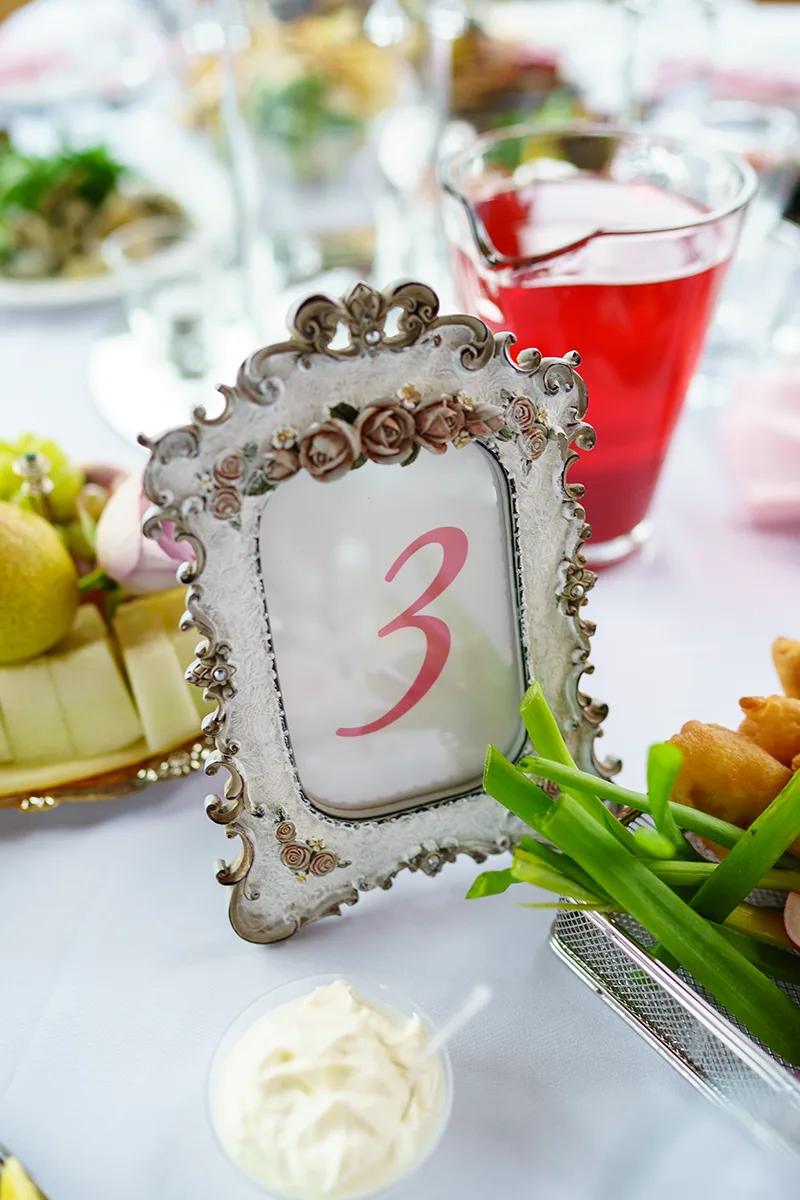 Зал и столы для гостей мы оформили заранее. Столы гостей украсили по центру цветочными композициями в высоких стеклянных цилиндрических вазах, стоящих на круглых зеркалах со стеклянными маленькими подсвечниками и свисающими гирляндами с искусственными хрусталиками. На каждый стол установили винтажную рамку с номером, соответствующим плану рассадки. Для каждого гостя пошили салфетки из того же тонкого и мягкого нежно-розового шелка, что и стол молодых. Каждую салфетку перевязали ленточкой и прикрепили индивидуальную карточку с именем и фамилией гостя. Салфетки разложили по места в соответствии с планом рассадки.