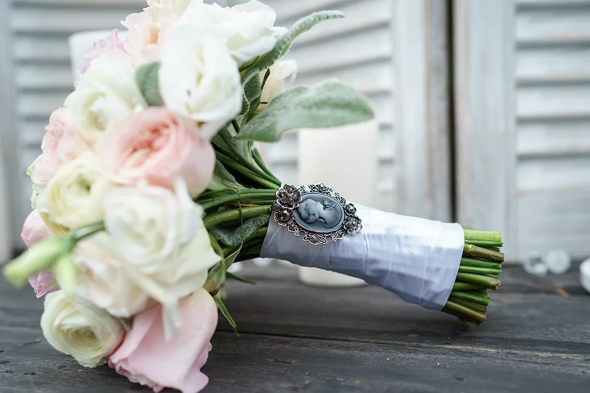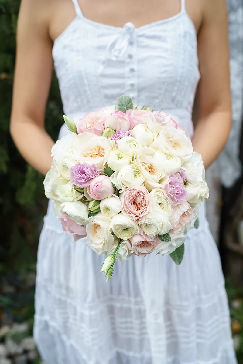 У нас получился кругленький как шарик, аккуратный и нежный свадебный букет из кремовых и нежно-розовых английских роз Дэвида Остина Джульет и Эдит, ароматных белых садовых роз Вайт О'Хара, нежно-розовых кустовых пионовидных роз Пиано Шарминг, белых ранункулюсов Элеганс, белых и лавандовых эустом со стахисом шерстистым, перевязанный атласной лентой и украшенный брошью с камеей. Подробнее про букет артикул 00847 и его состав.
