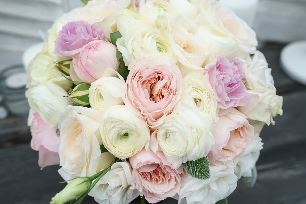 Для нашей дорогой классической свадьбы, букет невесты должен был быть идеальным, нежным, не маленьким, но аккуратным и, конечно изысканным и ароматным, с лучшими садовыми розами и обязательно чем-то пионовидными. А что может быть лучше садовых роз Дэвида Остина? Это же настоящая классика и законодатель моды среди пионовидных роз. А что может может иметь более приятный и насыщенный аромат чем садовые розы О'Хара? Его хочется вдыхать бесконечно! Что может быть более пионовидным, кроме пионов, когда им не сезон? Конечно белые ранункулюсы, как раз только начался сезон.