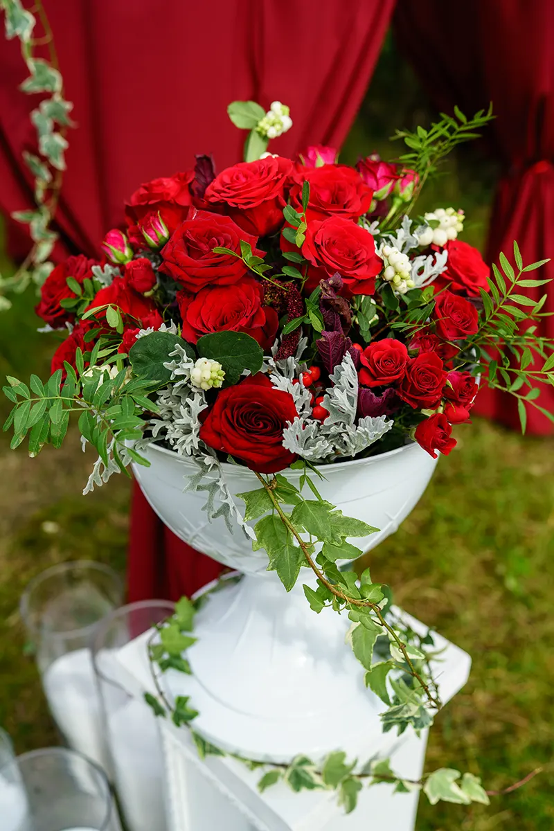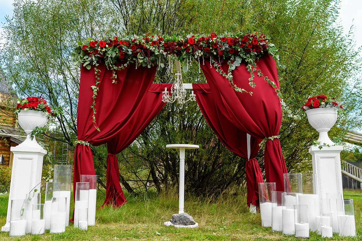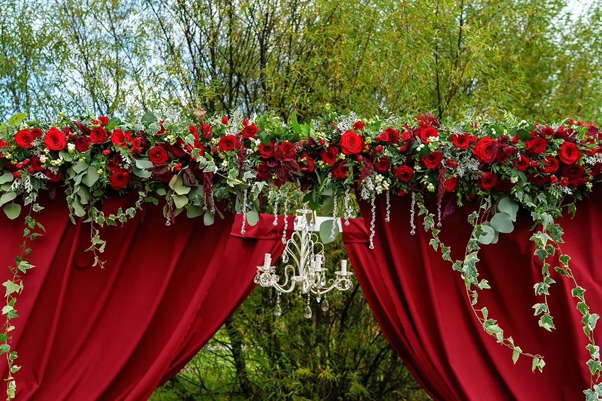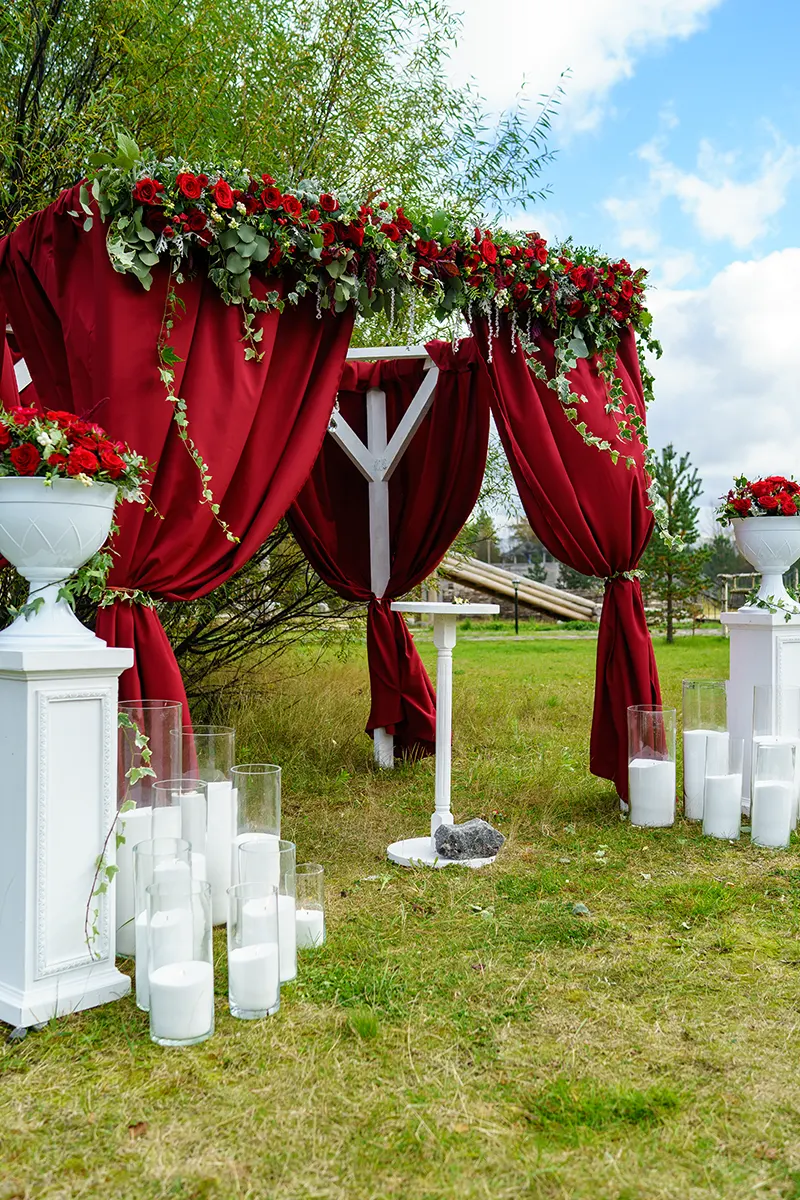Декор зала: Использование бархатных скатертей бордового цвета, украшение столов салфетками, свечами и цветочными композициями в тон. Для выездной регистрации подойдет арка, украшенная драпировкой из бордовой ткани и бордовыми цветами.