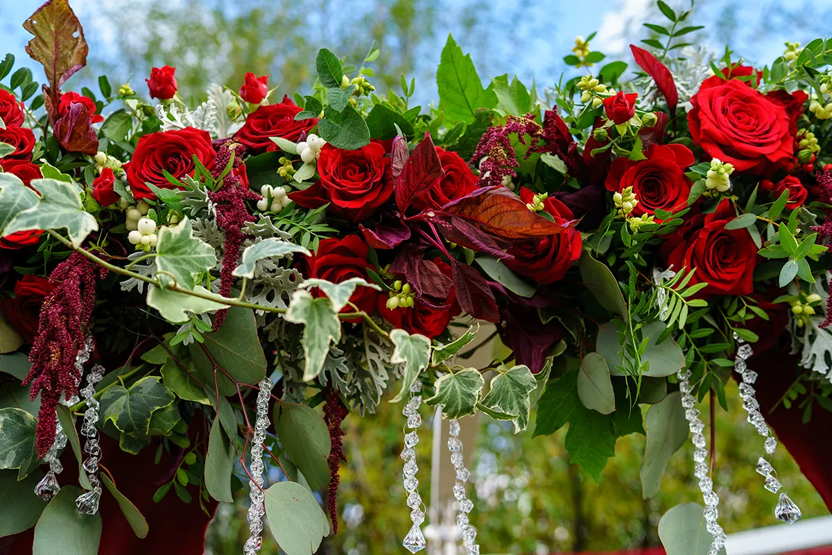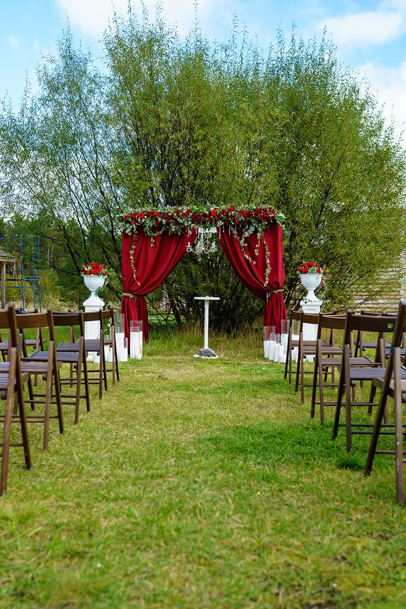 Выездную церемонию оформляли на территории базы отдыха "Лукоморье", где нашли укромное место под раскидистой ивой, недалеко от зала торжества. Для выездной церемонии мы использовали большую деревянную белую свадебную арку, которую украсили плотной бордовой тканью. Посередине арки повесили классическую люстру с хрусталем. Фронтон свадебной арки по всей длине украсили объемной осенней цветочной композицией с бордовыми розами, красными кустовыми розочками, бордовым амарантом, белым снежноягодником, раскидистым плющом и свежей зеленью.
