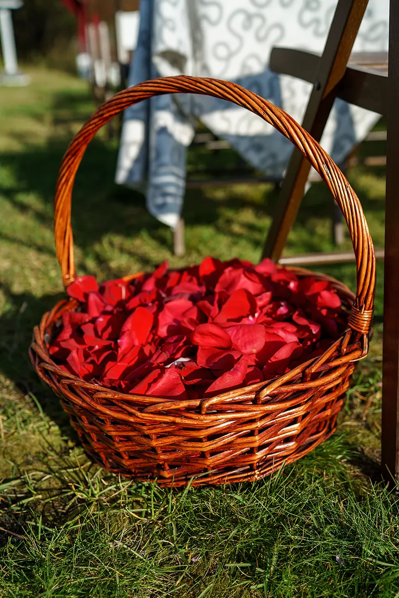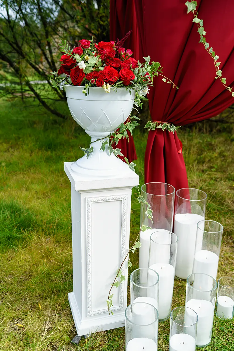 Перед аркой поставили белые декоративные тумбы, на которые установили вазы с большими бордовыми цветочными композициями. Рядом установили большие стеклянные насыпные свечи, высокий столик для колец, рассыпали рядом много бордовых лепестков и поставили корзину, наполненную лепестками.