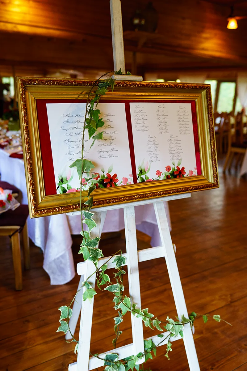 - Оформление планов рассадки на картине из красного бархата с широкой золотой рамкой на белом состаренном мольберте;