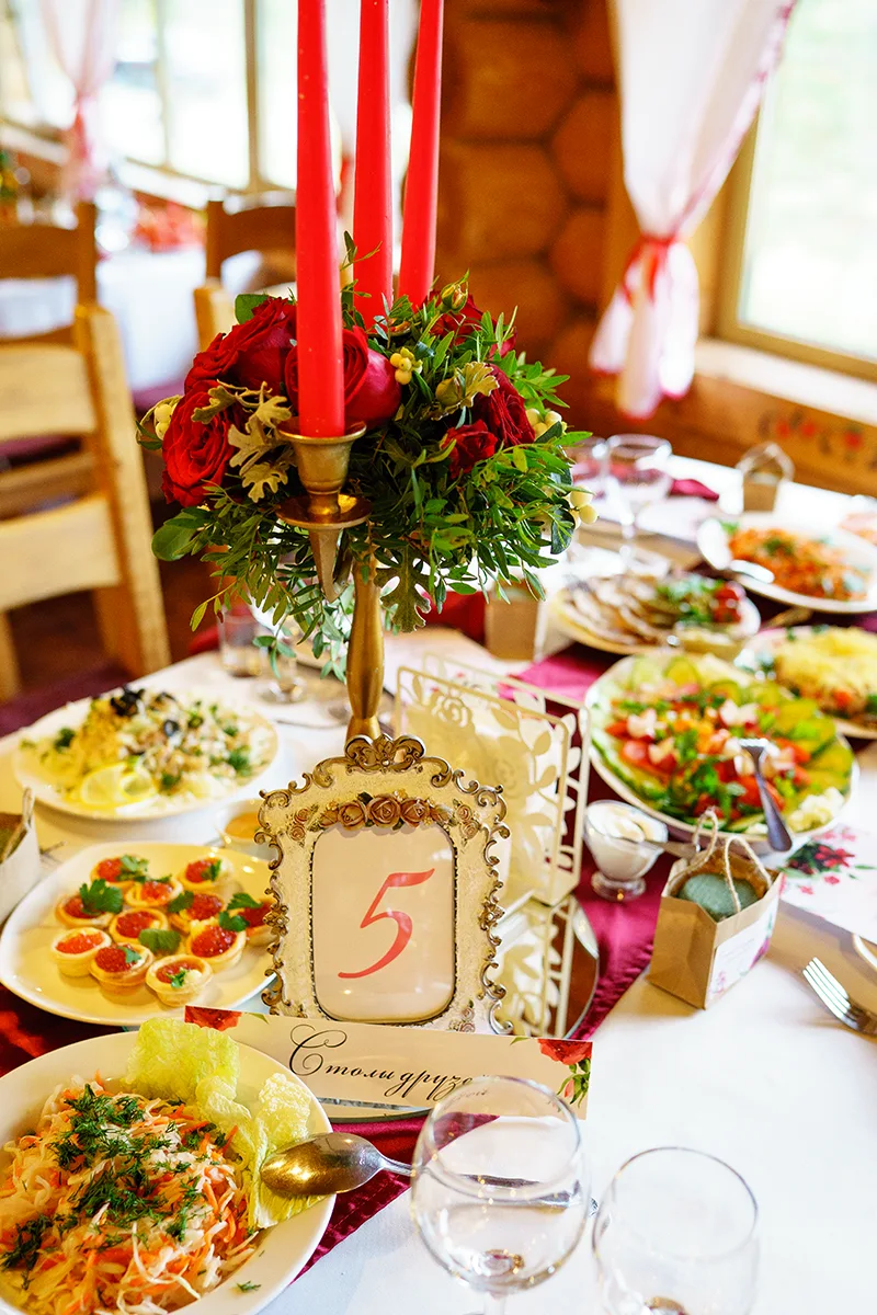 Столы гостей украсили наперонами винного цвета, по центру цветочными композициями в высоких золотых подсвечниках с красными свечами. На каждый стол установили винтажную рамку с номером, соответствующим плану рассадки.
