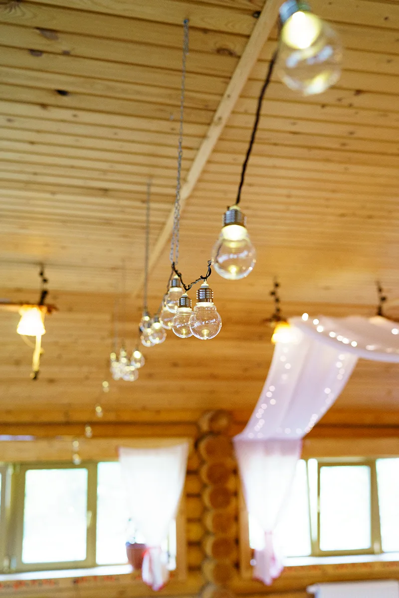 Под потолком зала натянули белые полупрозрачные ткани и украсили их белыми гирляндами. Также зал украсили специально изготовленными гирляндами из старых лампочек на черных шнурах.