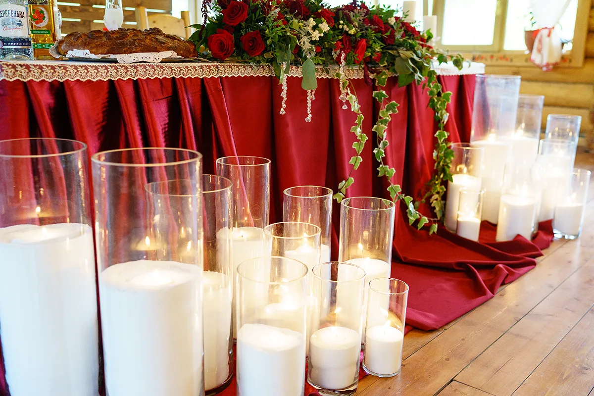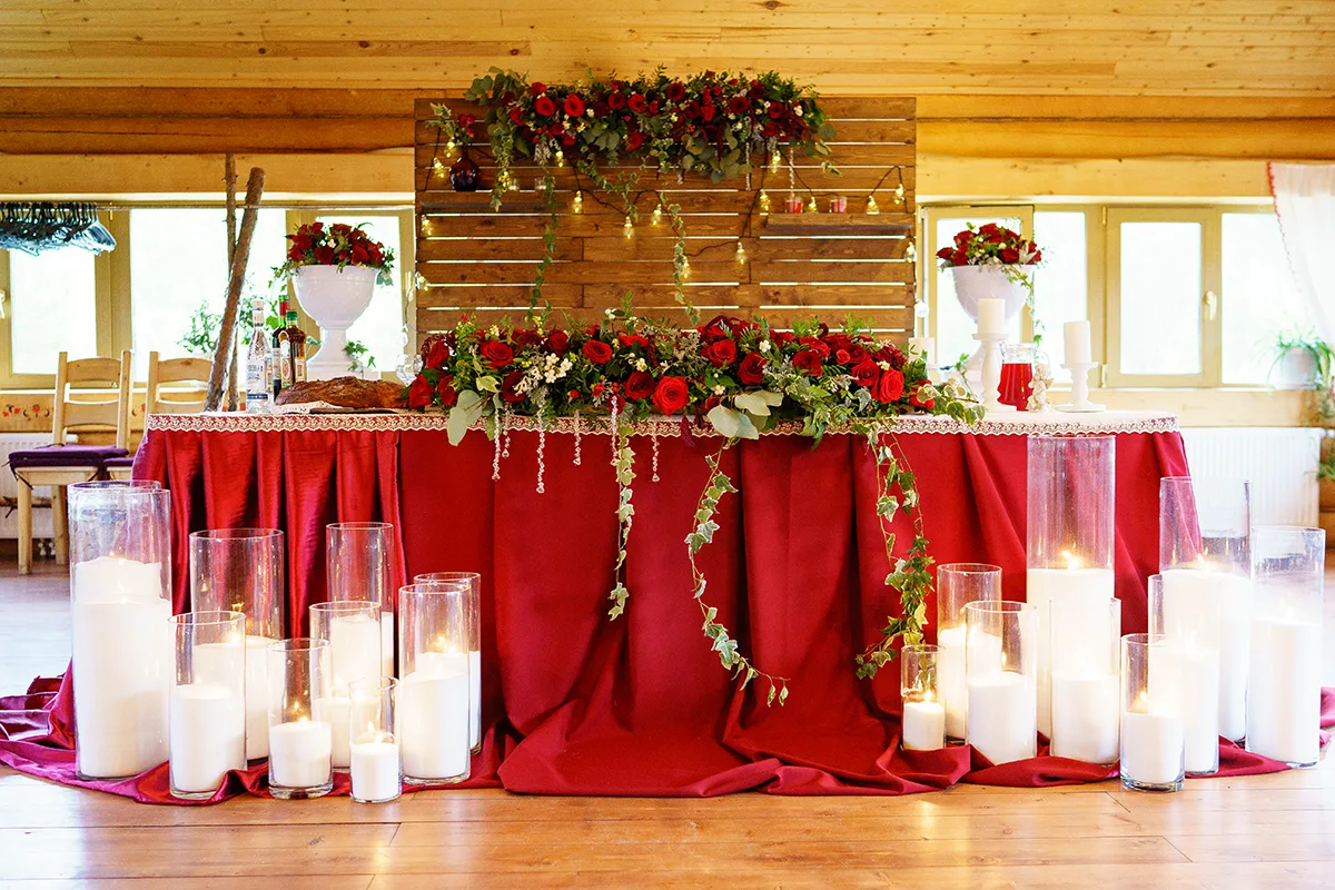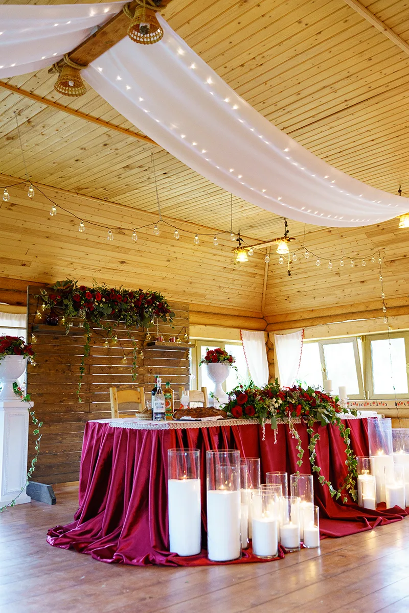 Большой стол молодых задрапировали бордовой атласной тканью с кружевом, украсили подсвечниками с массивными свечами и поставили на него половину композицию из живых цветов, демонтированную с арки. Перед столом поставили стеклянные насыпные свечи, а позади стола для фона поставили специально созданный деревянный фон с полочками, который украсили второй половиной цветочной композиции с арки и гирляндой. На полочки фона установили маленькие свечи в стеклянных подсвечниках. С боков фона установили декоративные тумбы с цветочными вазами.