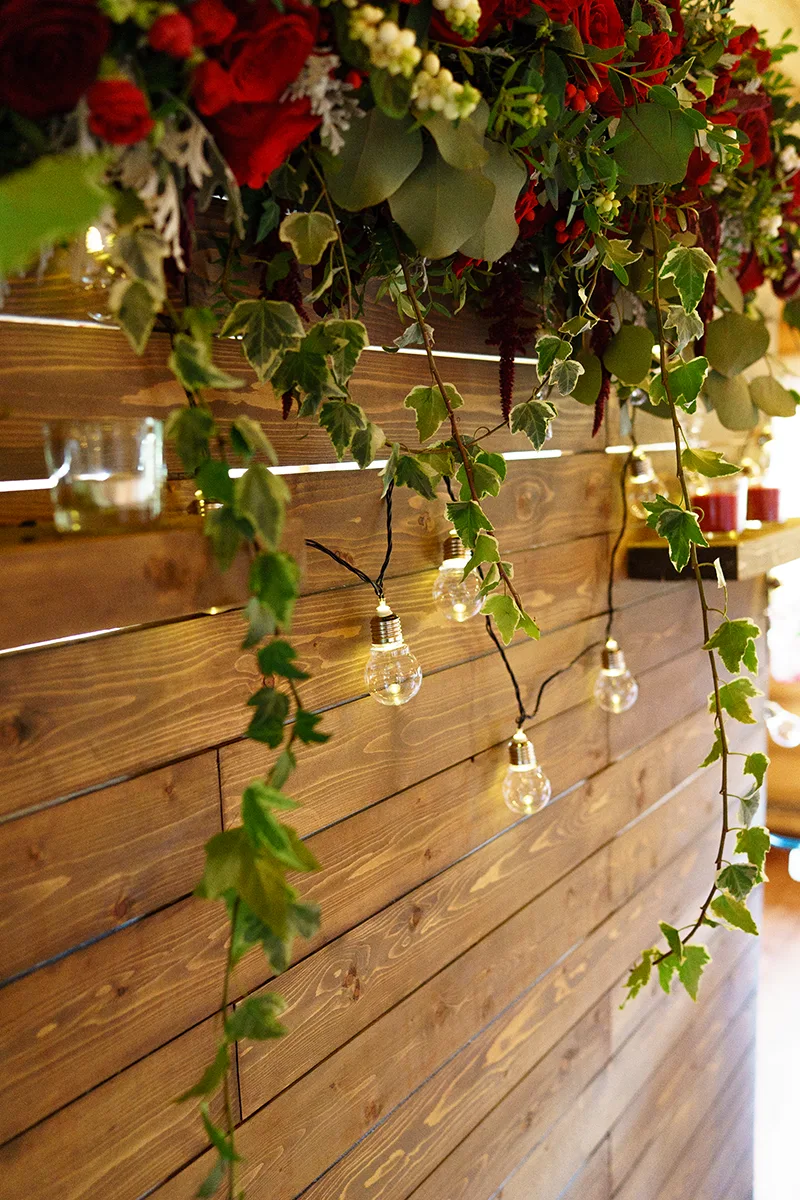 - Оформление стола молодых деревянным фоном с цветочной композицией и гирляндой из ламп, тканями, цветочными композициями в вазах на тумбах, стеклянными насыпными свечами, подсвечниками и свечами, оформление потолка зала тканью и гирляндами;