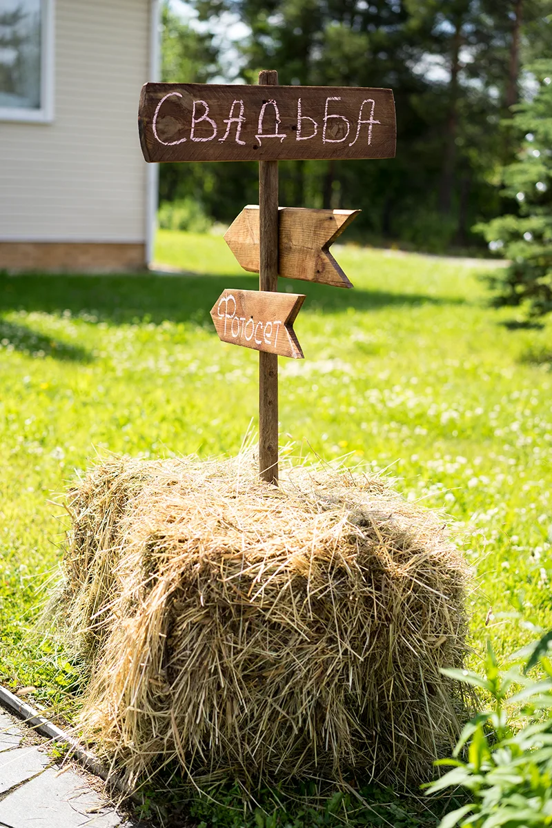 На территории мы установили брикет сена, в который воткнули деревянный указатель с табличками "Свадьба" и "Фотозона".