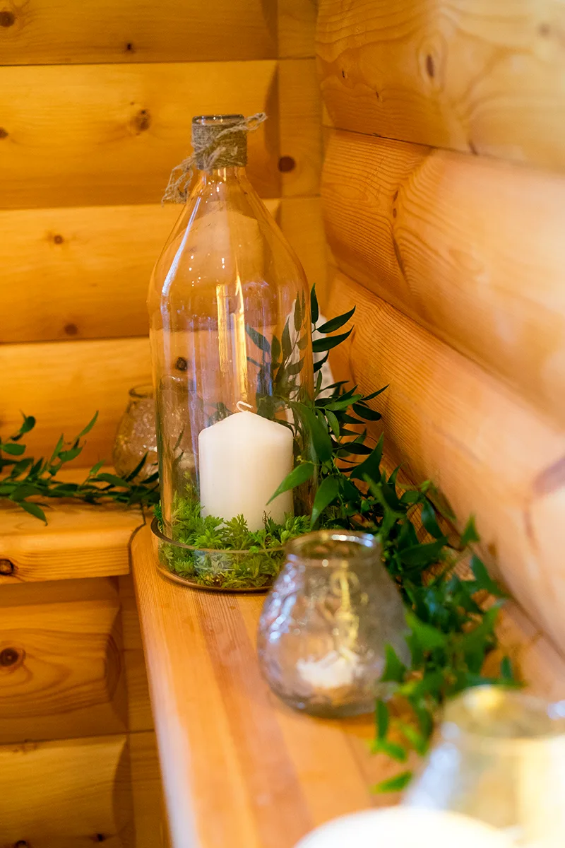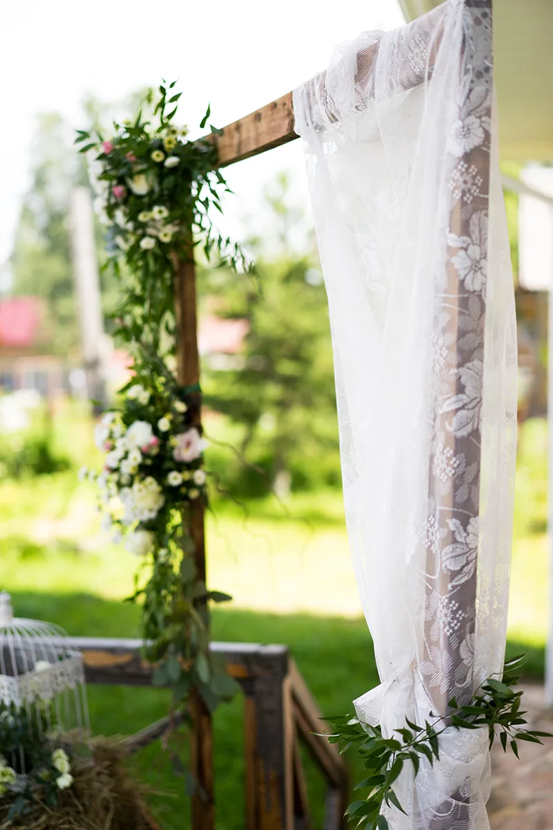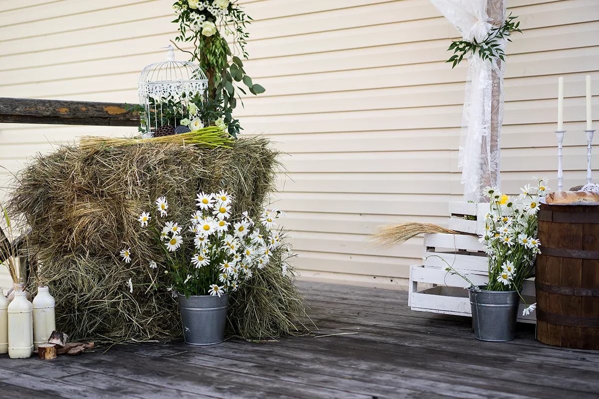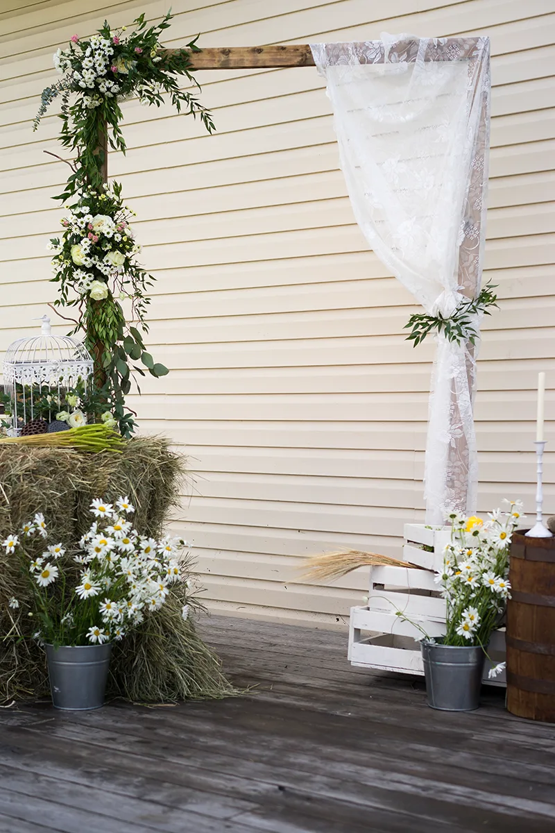 На террасе загородного дома мы организовали фотозону из деревянной свадебной арки, которую украсили узорчатым тюлем и небольшими цветочными композициями из роз, хризантем, ромашек с эвкалиптом, рускусом и фисташком. Рядом расставили брикеты сена, деревянную бочку, деревянные ящики, свечи и ведра с ромашками. Оформили все простым декором, сухоцветами, крашенными бутылками и спилами дерева.