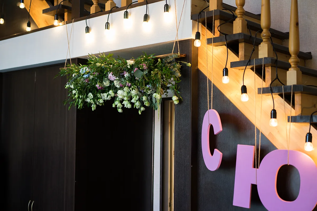 Над входом в банкетный зал мы повесили цветочную композиции из роз, пионов, эустом, фрезий, гортензии, рускуса, эвкалипта и фисташки. Рядом повесили инициалы молодых из фанеры и украсили все винтажной гирлянды из лампочек на черном шнуре.