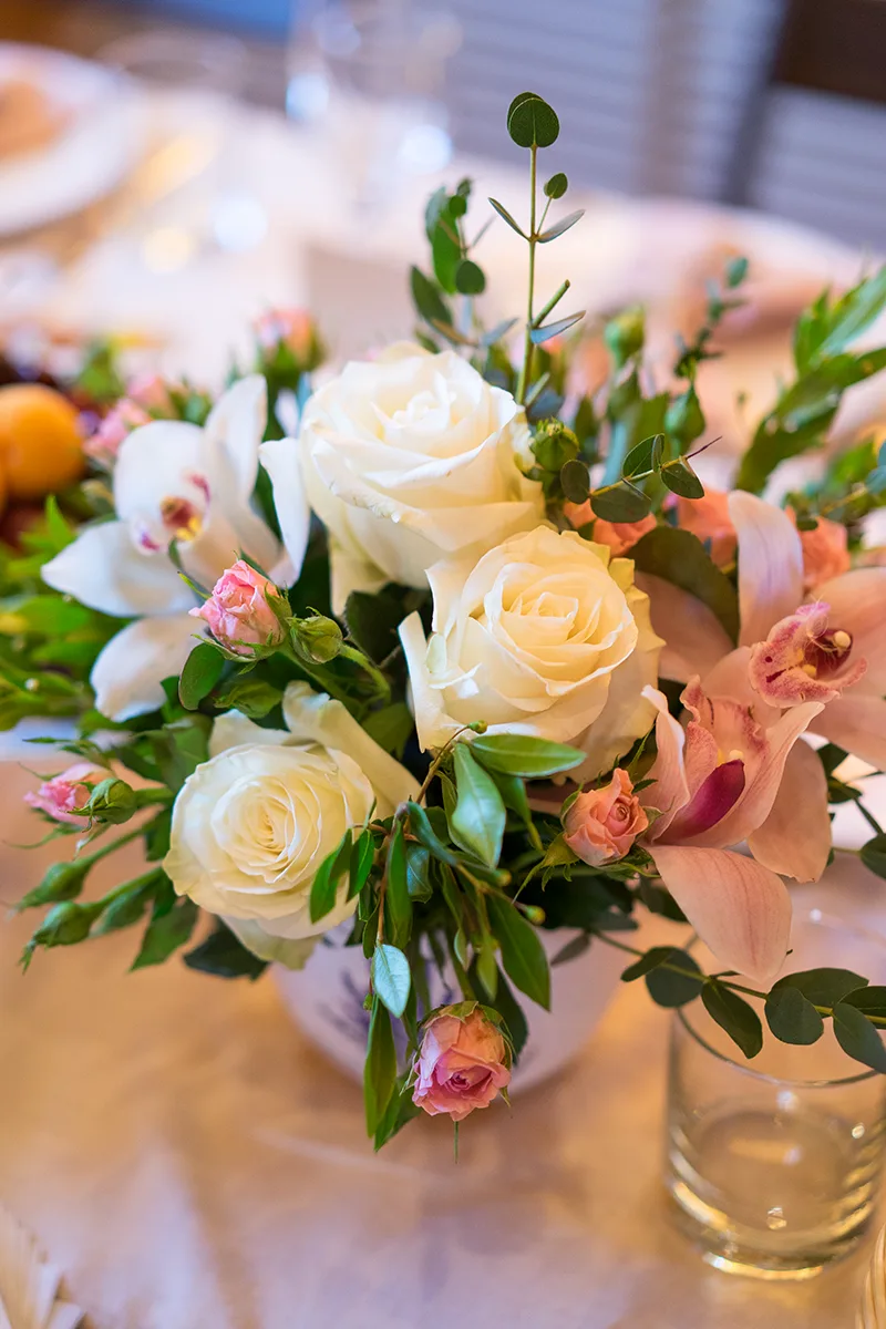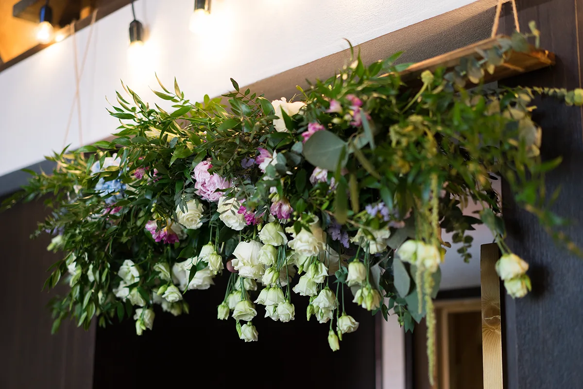 - Создание свисающей цветочной композиции над входом в банкетный зал из роз, пионов, эустом, фрезий, гортензии, рускуса, эвкалипта и фисташки;
