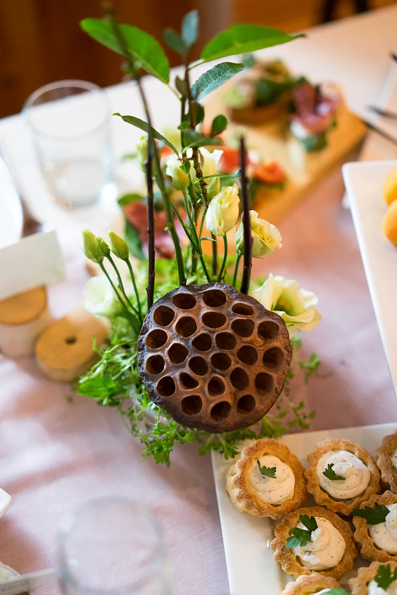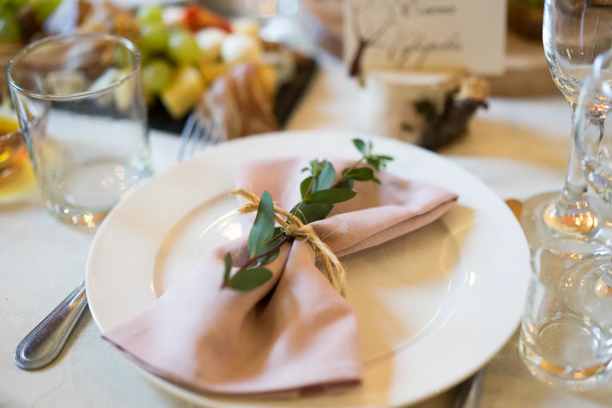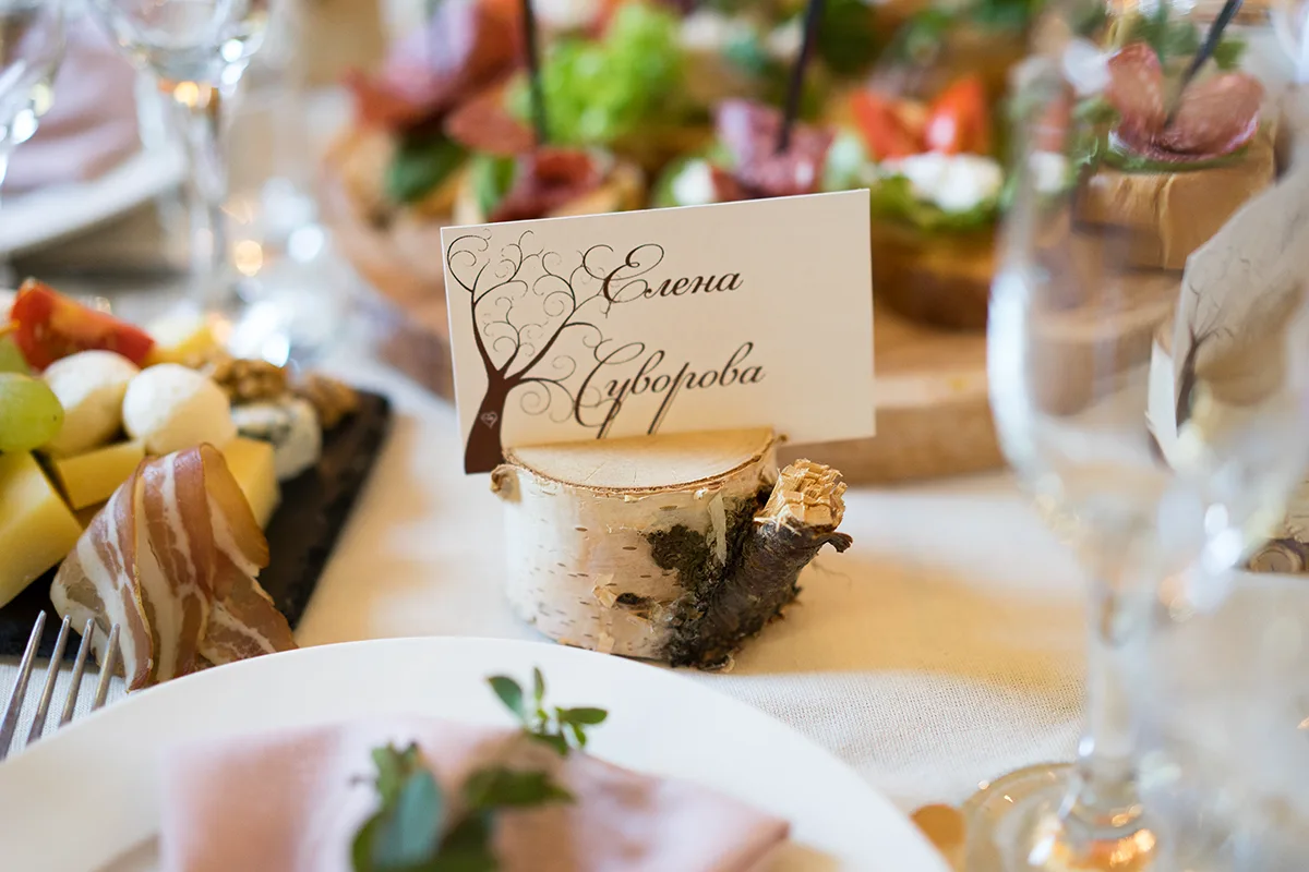 Для гостей мы напечатали именные карточки и изготовили для них подставки из березовых спилов. Также пошили салфетки из натурального льна. Стол украсили простыми композициями из свежей зелени, веток, сухоцветов и небольших цветочков.
