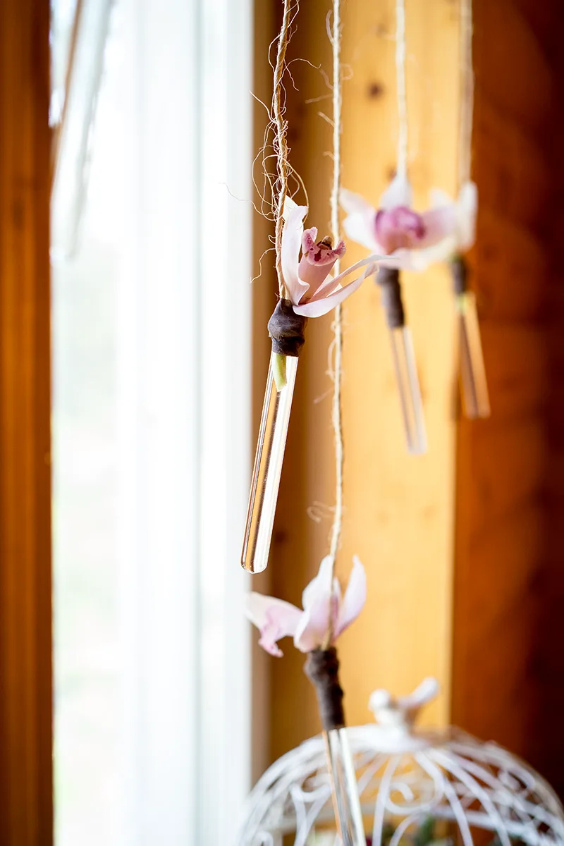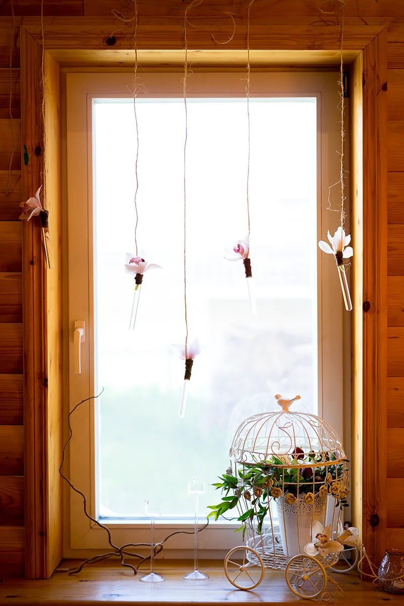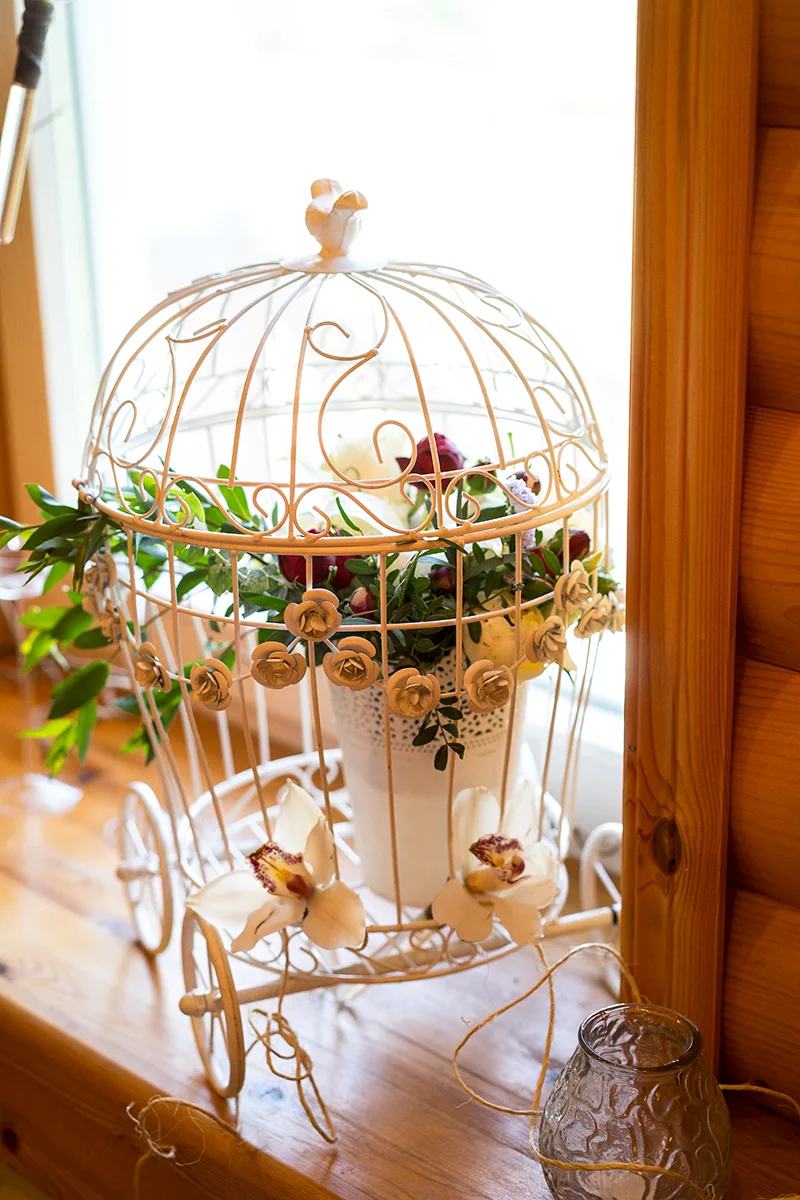 Зону молодых оформили двумя цветочными композициями из роз, кустовых розочек и орхидей с зеленью. Расставили рядом стеклянные подсвечники, поставили декоративную клетку с цветочной композицией внутри и повесили на окно цветочки орхидей в стеклянных колбочках.