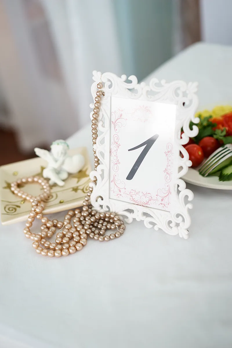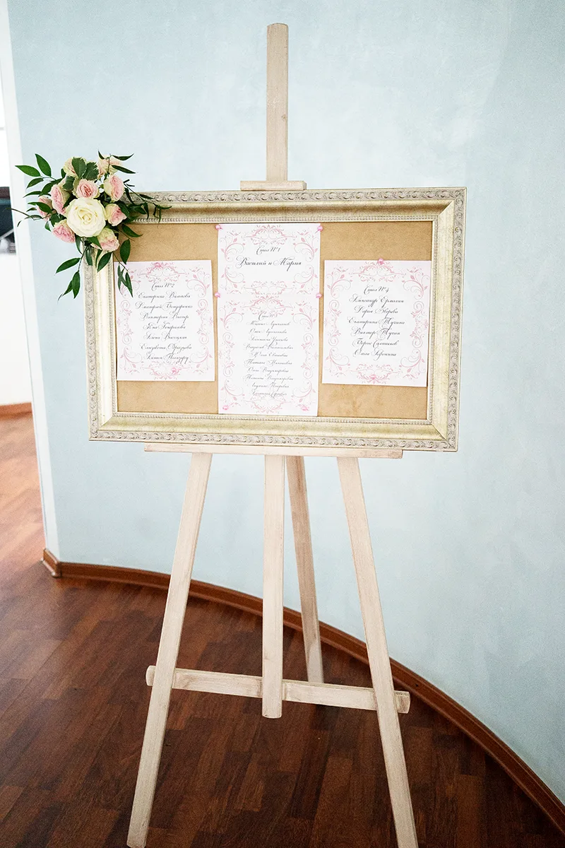 - Создание карточек гостей, номеров столов и плана рассадки на мольберте с винтажной картинной рамкой;