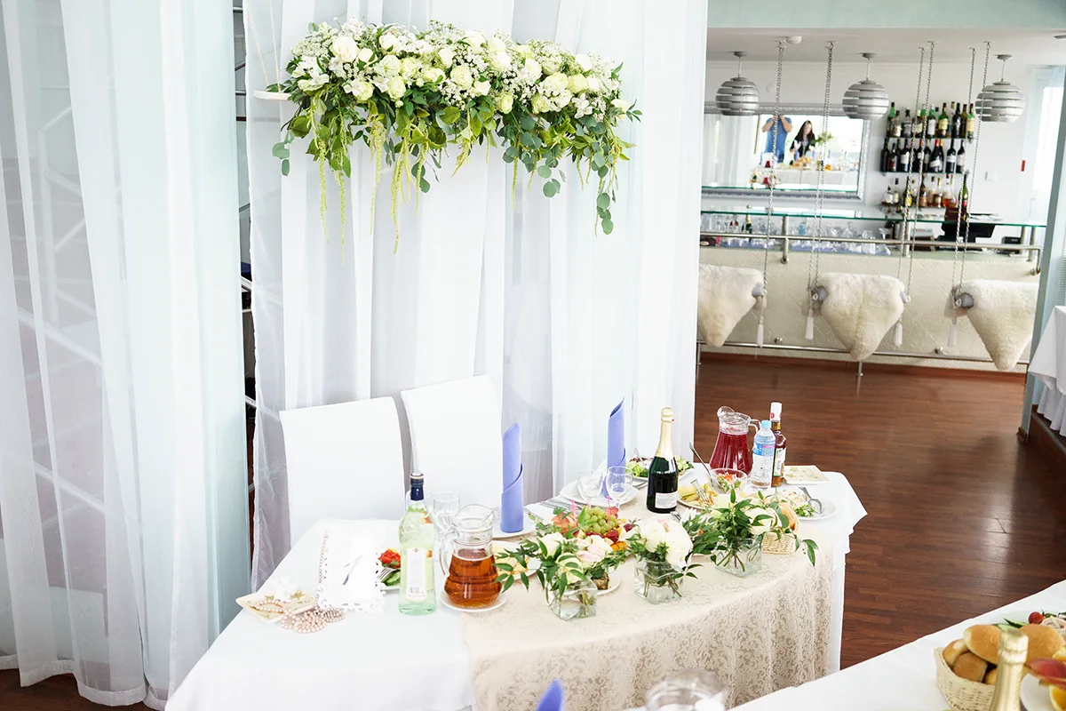 - Создание висящей цветочной композиции для стола молодых, оформление стола цветами и тканью;