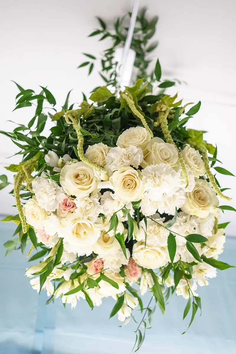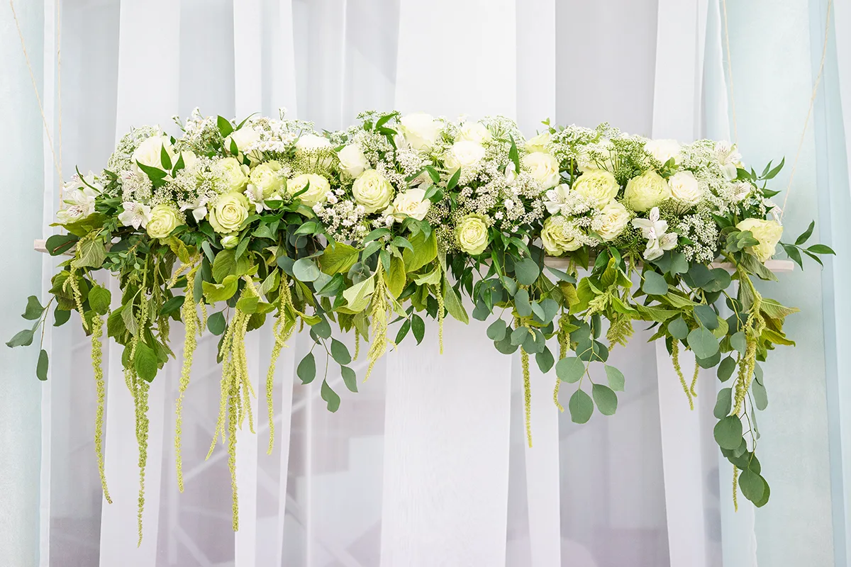 Флористика: «Парящие» и подвесные композиции из легких, воздушных цветов (например, гипсофила, эустома, пионы) и зелень, напоминающая о природе.