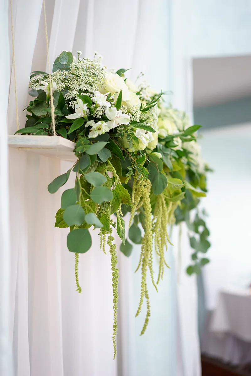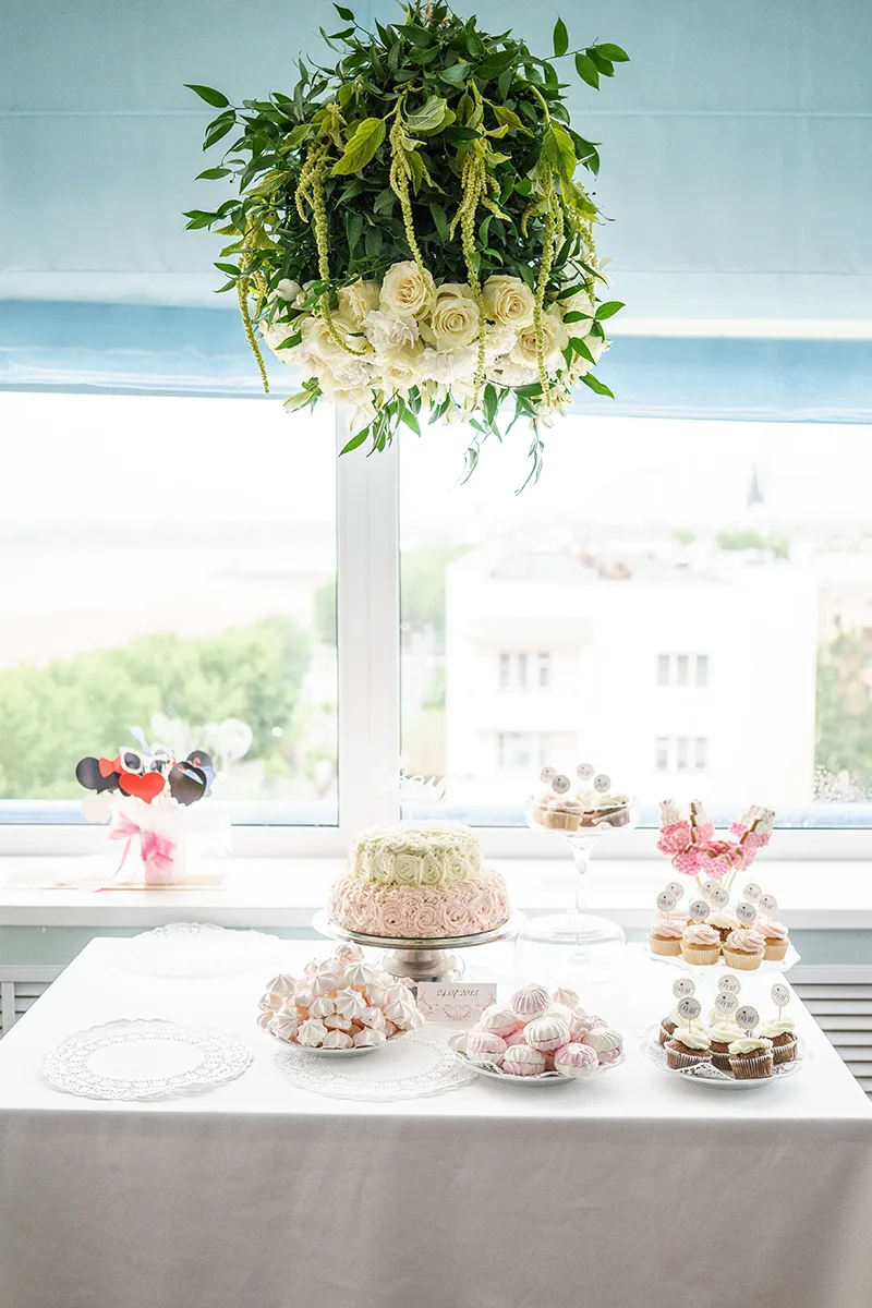 - Создание свисающей цветочной композиции над кэнди-баром;
