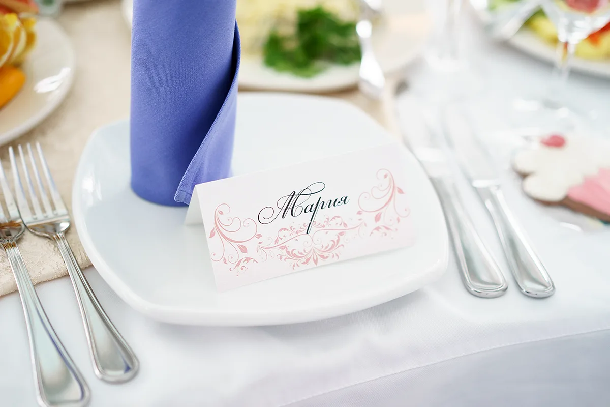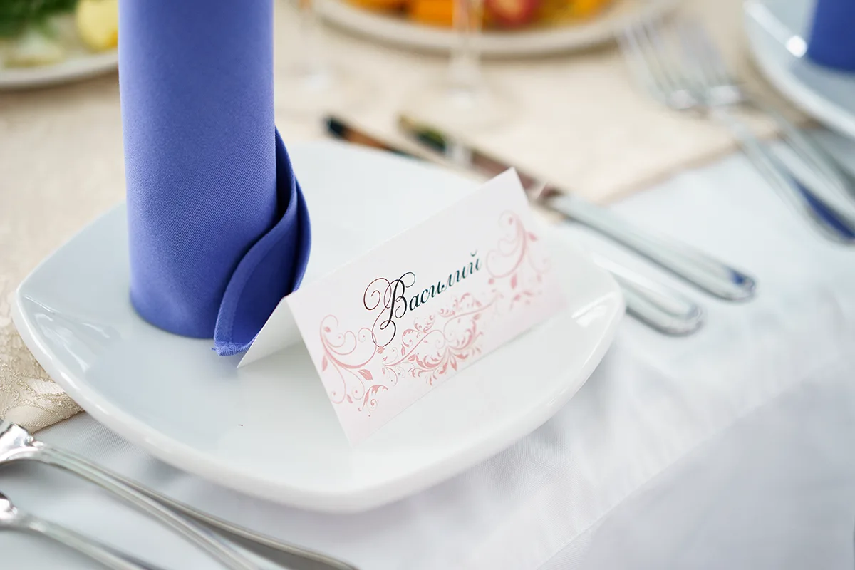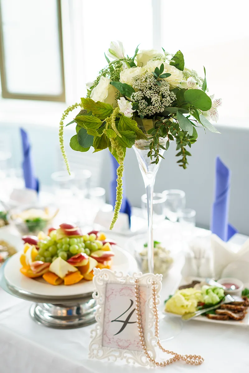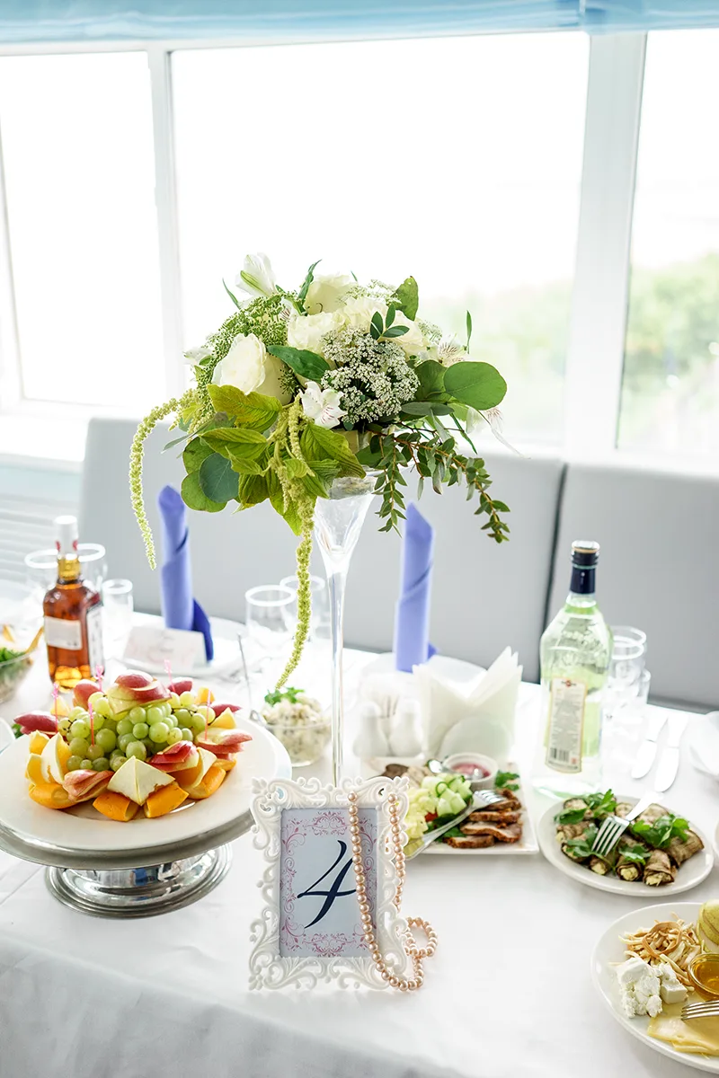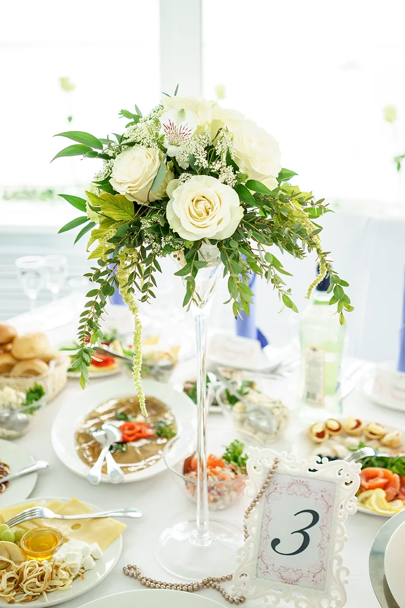 - Оформление столов цветочными композициями с номерами и карточками гостей;