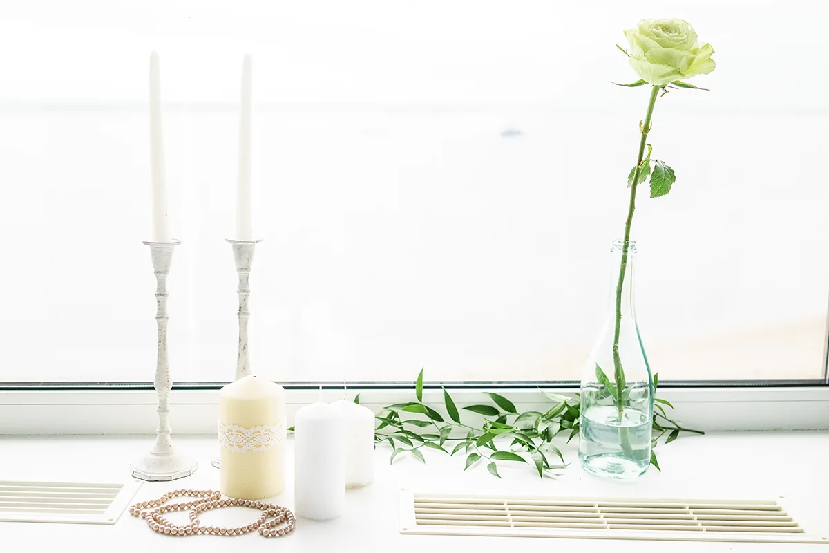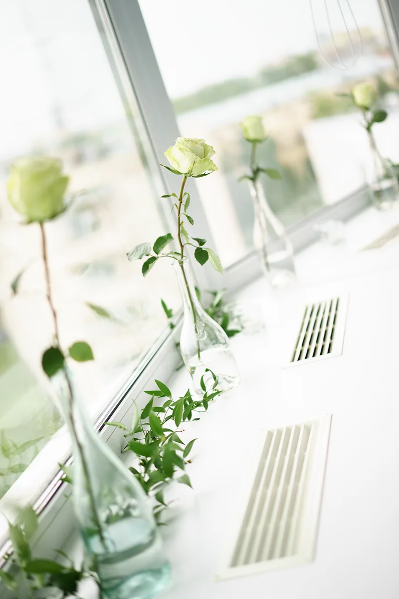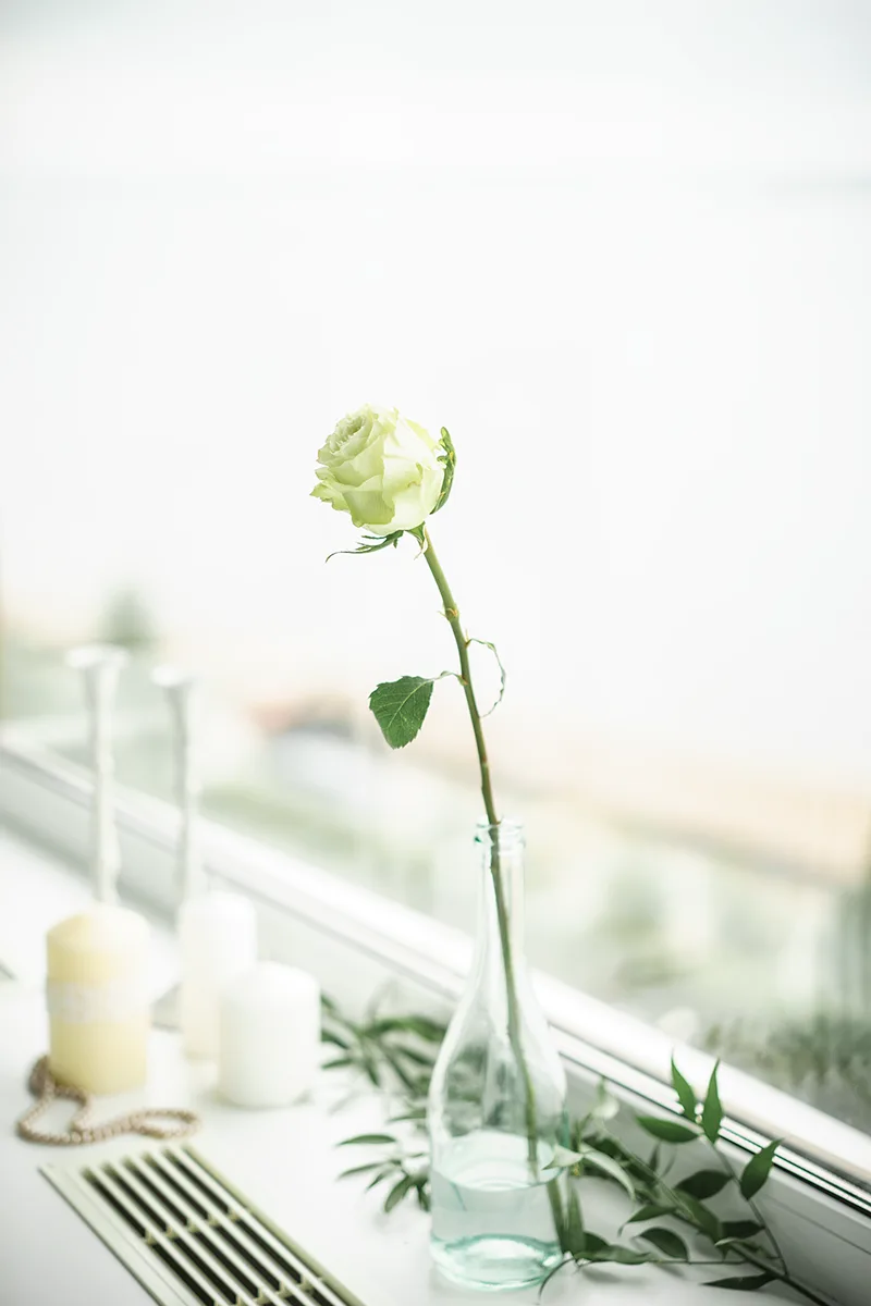 Ощущение воздушности в локации есть уже "by design", благодаря высоким этажам и панорамным видам на реку, но нужно было добавить совсем чуть-чуть уюта. Мы расставили по подоконникам разные свечи и подсвечники и одинокие белые розы в прозрачных винных бутылках, небрежно разложили золотые бусы и ветки итальянского рускуса.