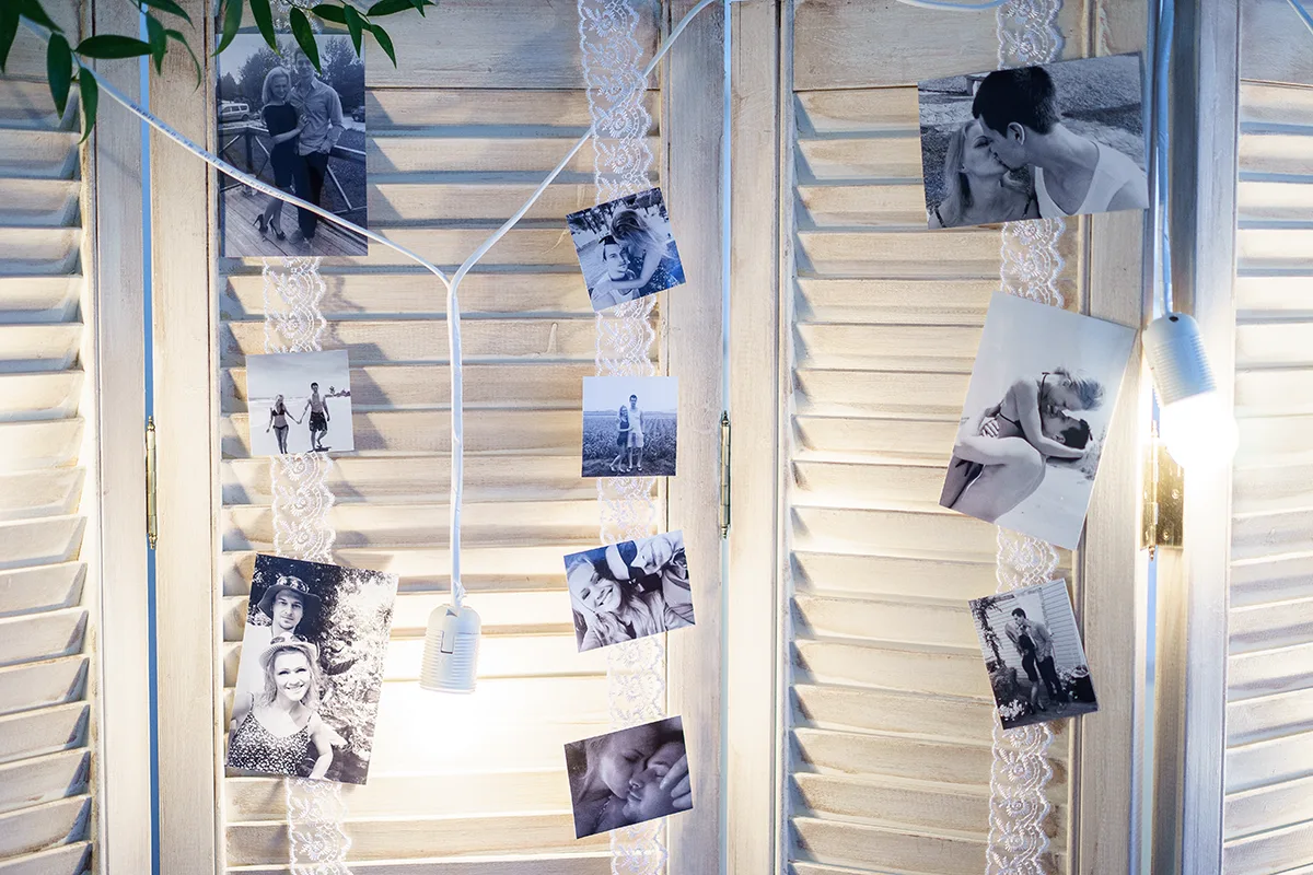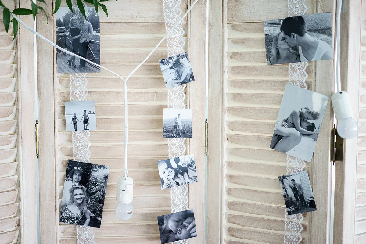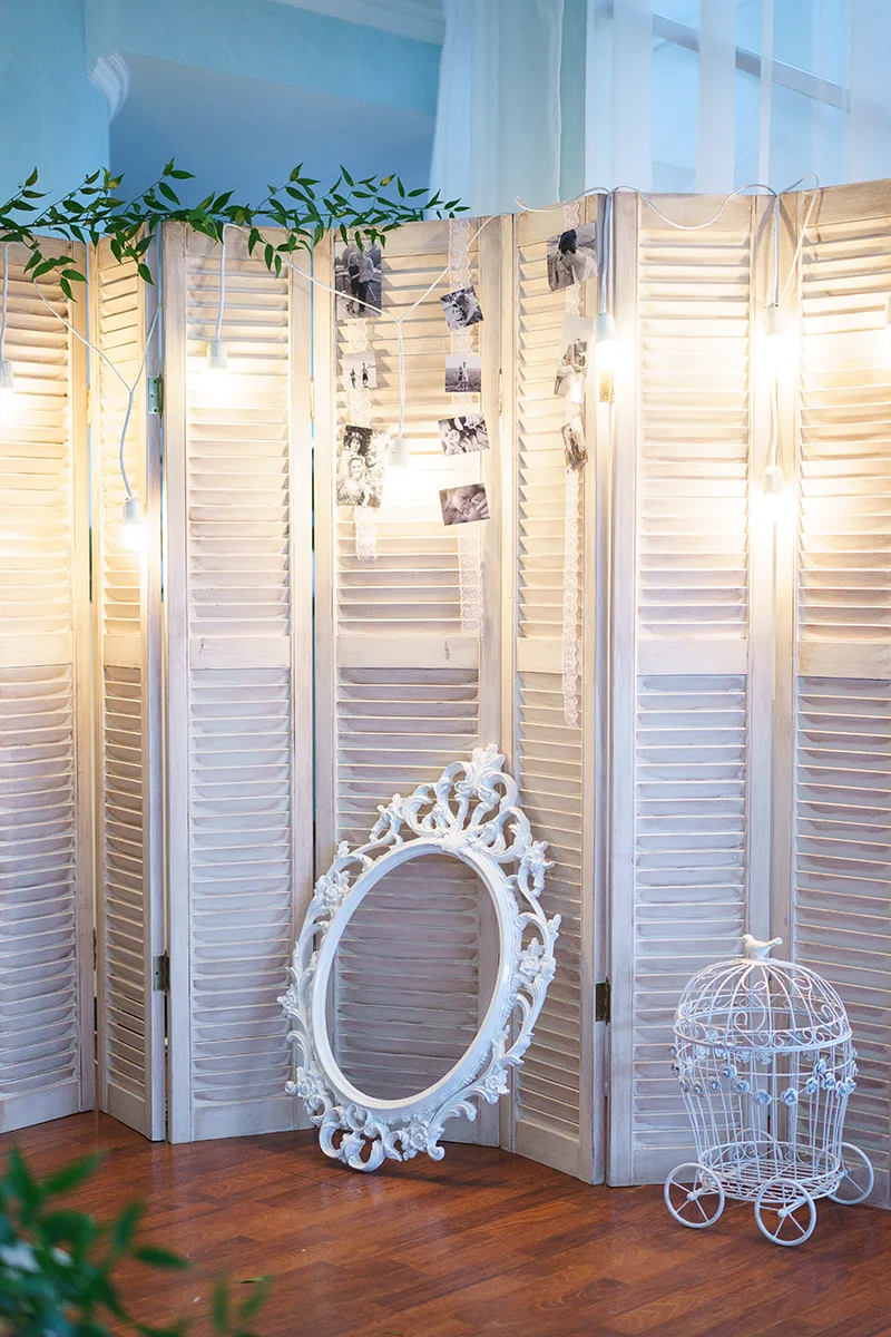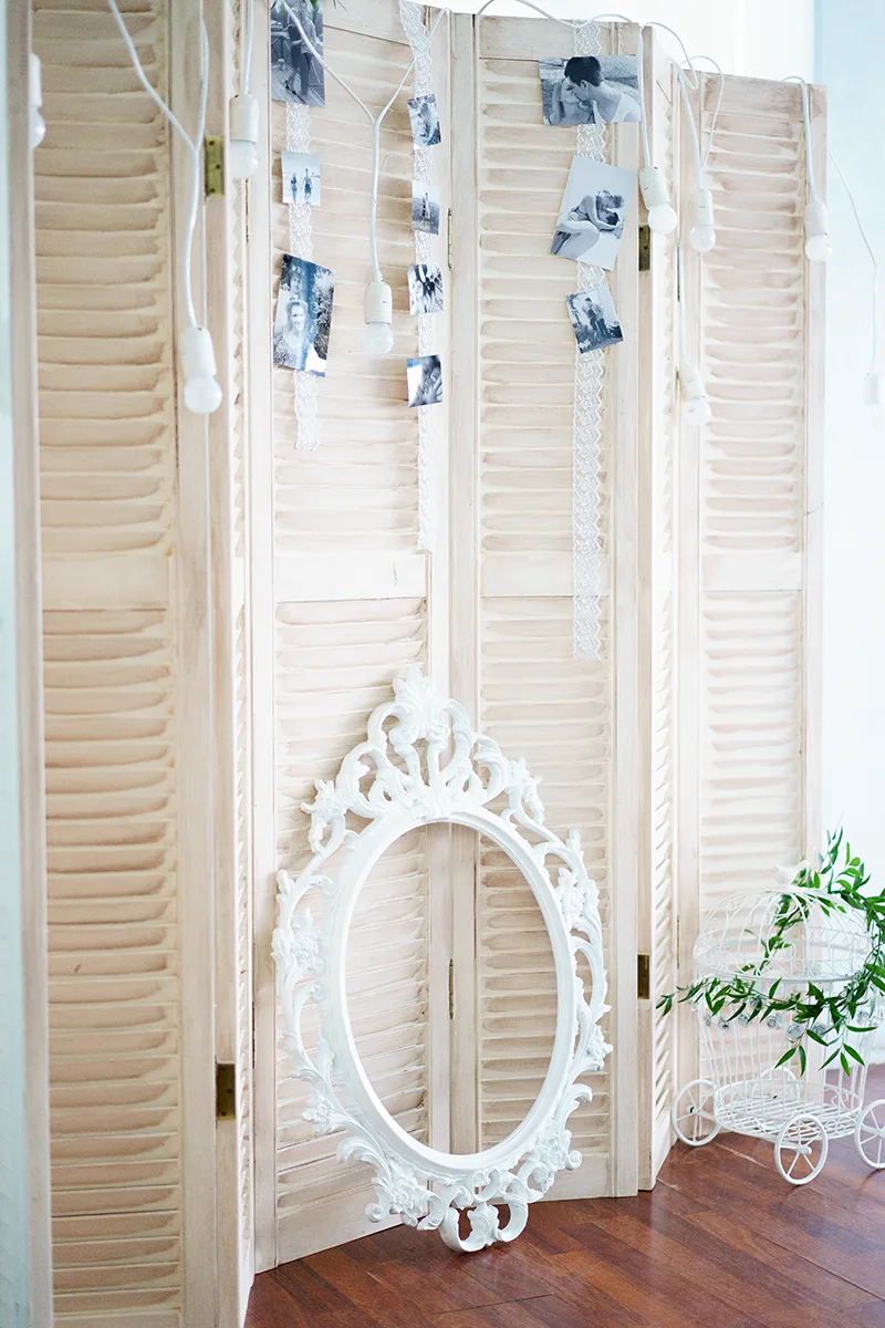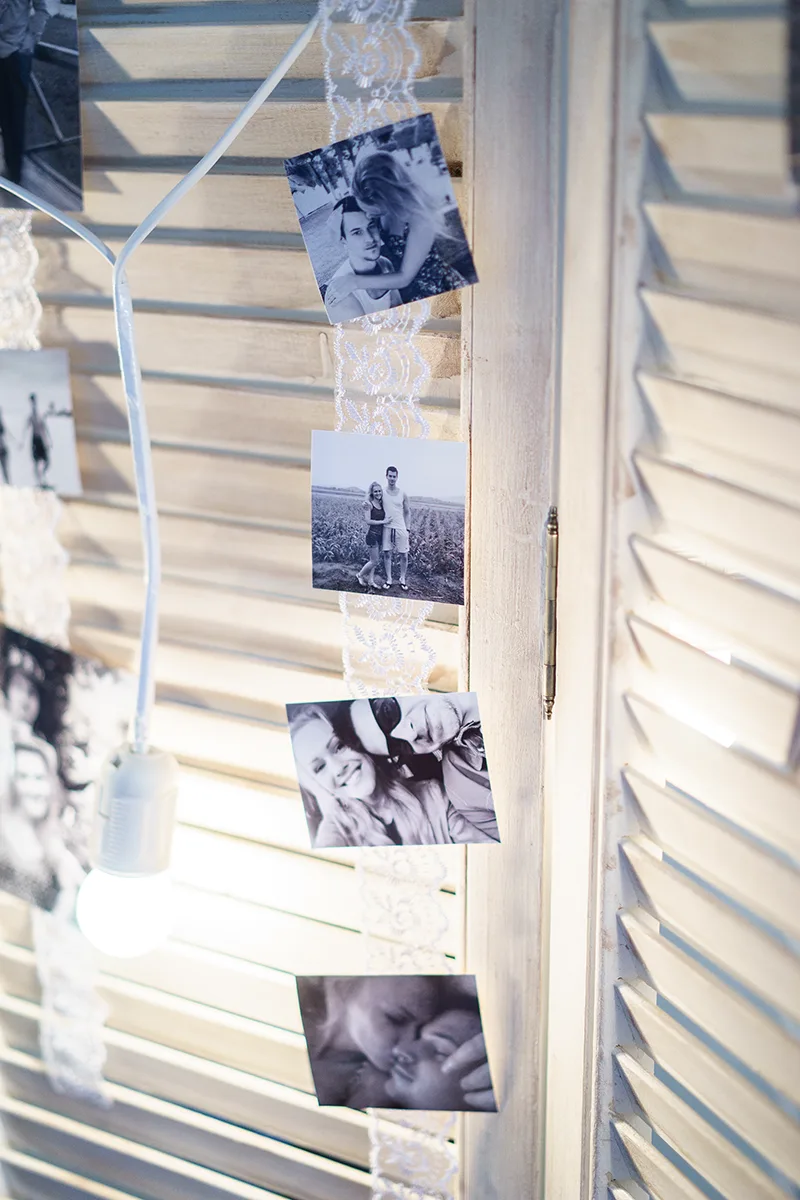 - Создание и оформление фотозоны — белая деревянная состаренная ширма, гирлянда из белых лампочек, ажурная винтажкая рамка, черно-белые фотографии;