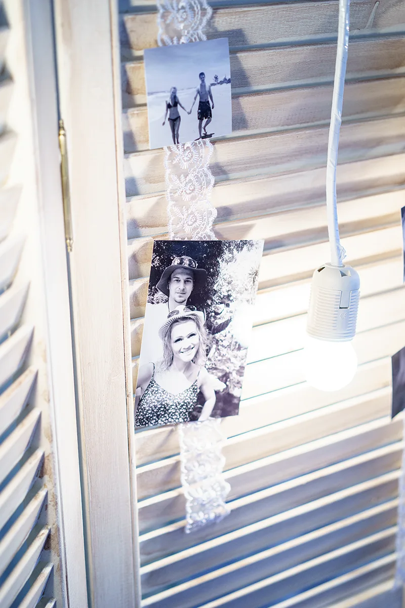 Для создание фотозоны мы установили пудровую деревяную состаренную ширму, украсили ее белой гирляндой из белых лампочек, ажурной винтажной рамкой и развесили по ширме на кружевных лентах черно-белые фотографии молодоженов.